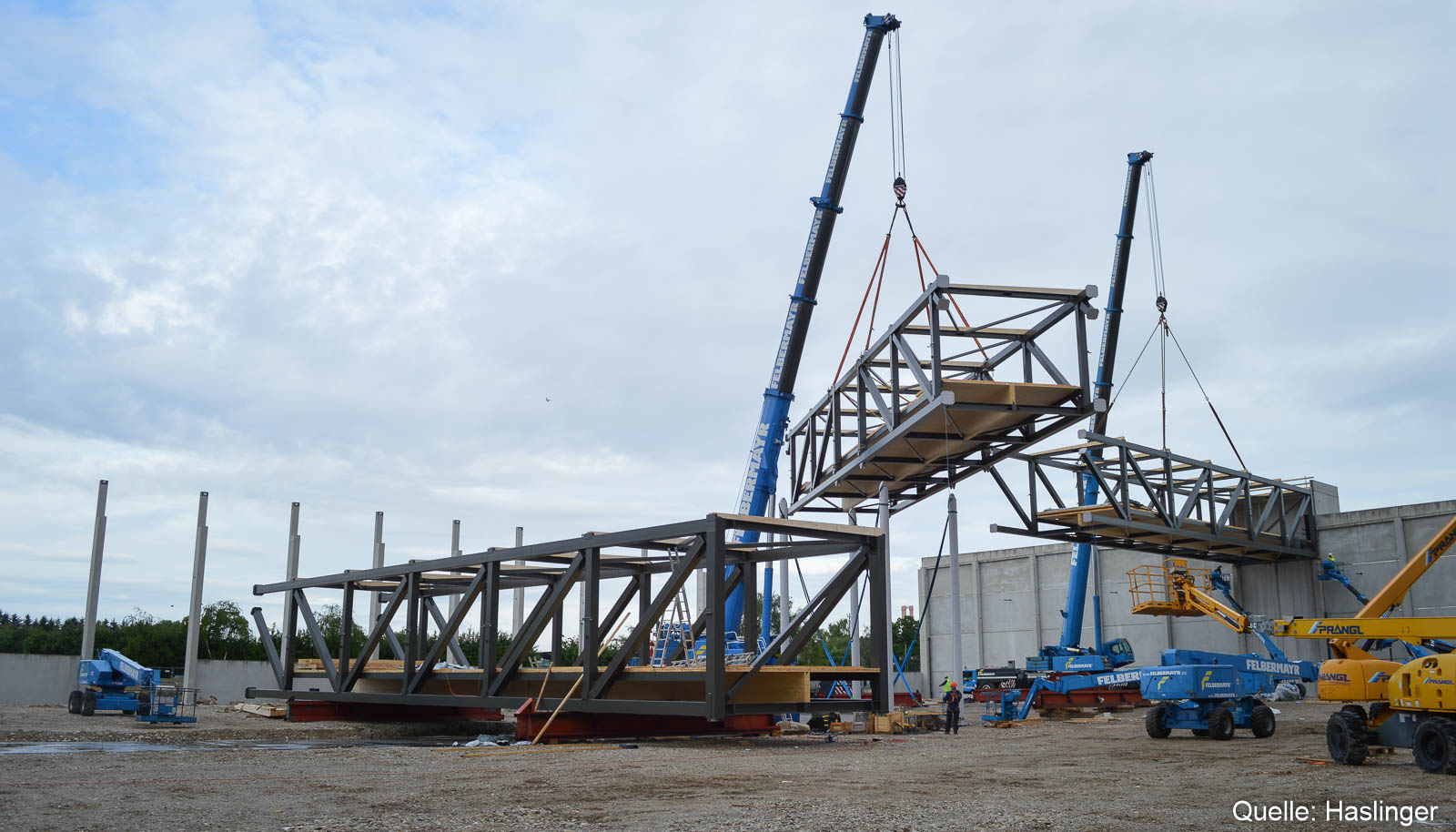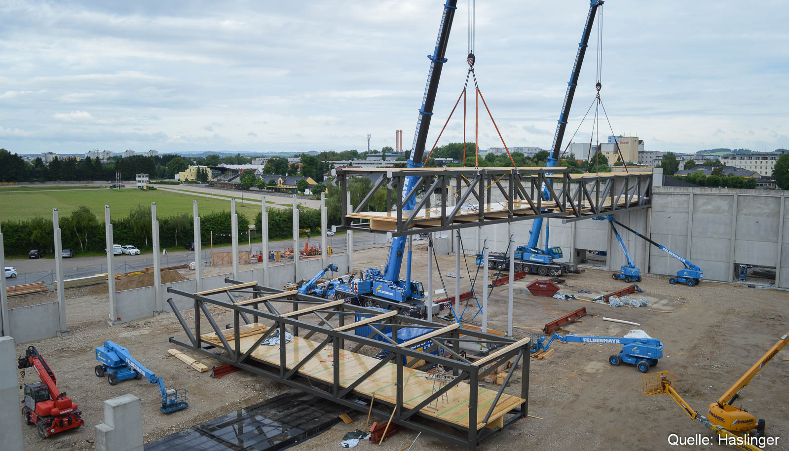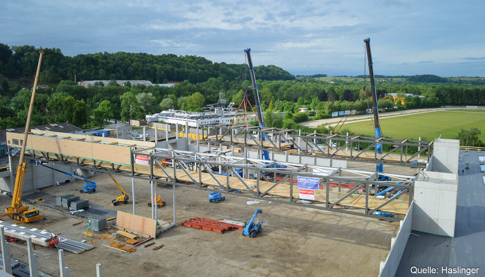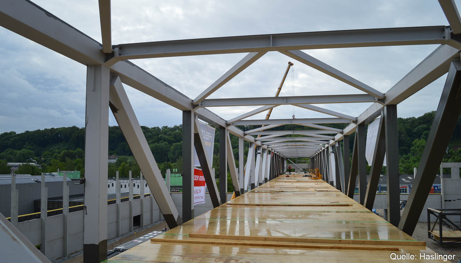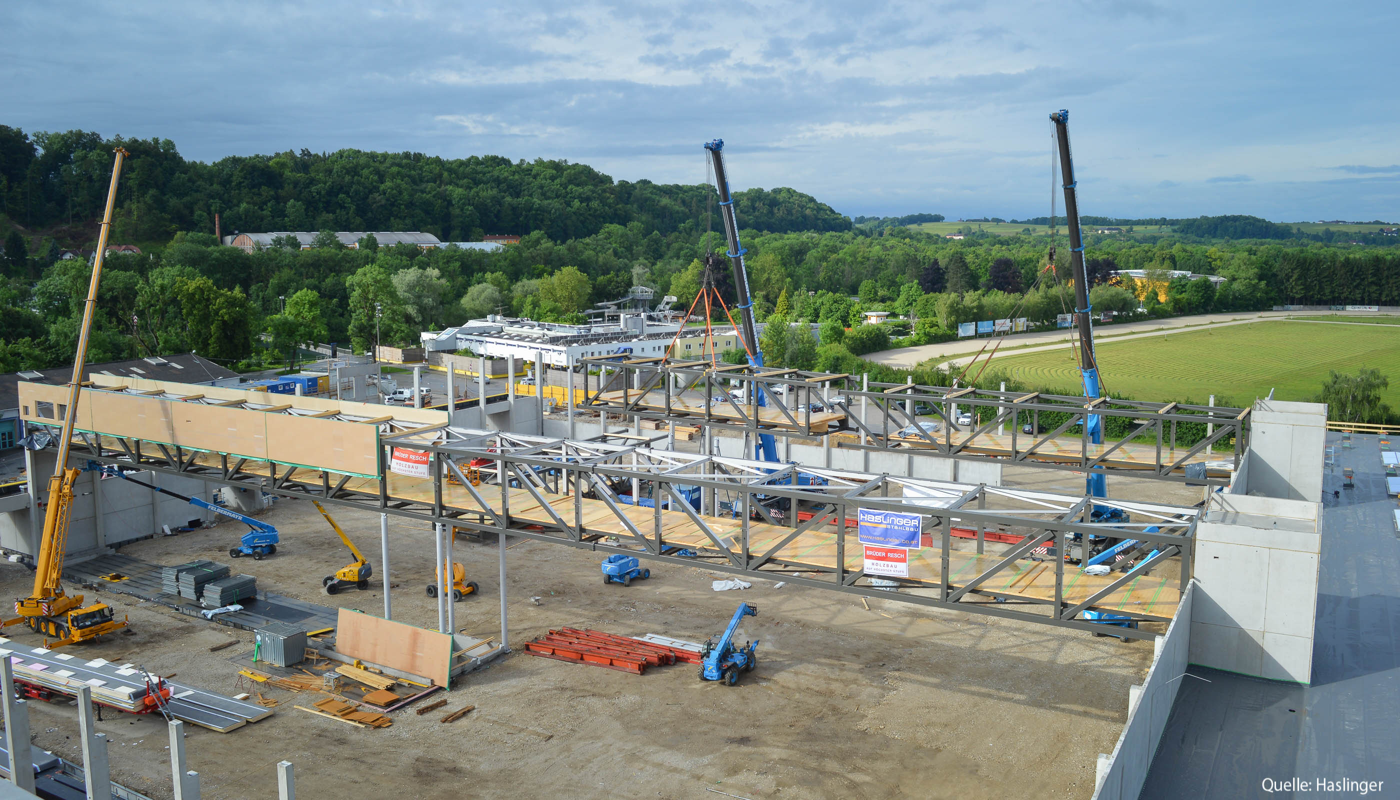 The services rendered by HASLINGER STAHLBAU included the planning, manufacturing, delivery and assembly of the primary load-bearing structure, consisting of trusses as a two-piece load-bearing unit with a length of 95 m. The individual parts were pre-made with a length of up to 34 m and a width of 5,2 m. The load-bearing roof construction was implemented in the form of six pre-assembled elements that each weigh up to 80 t.