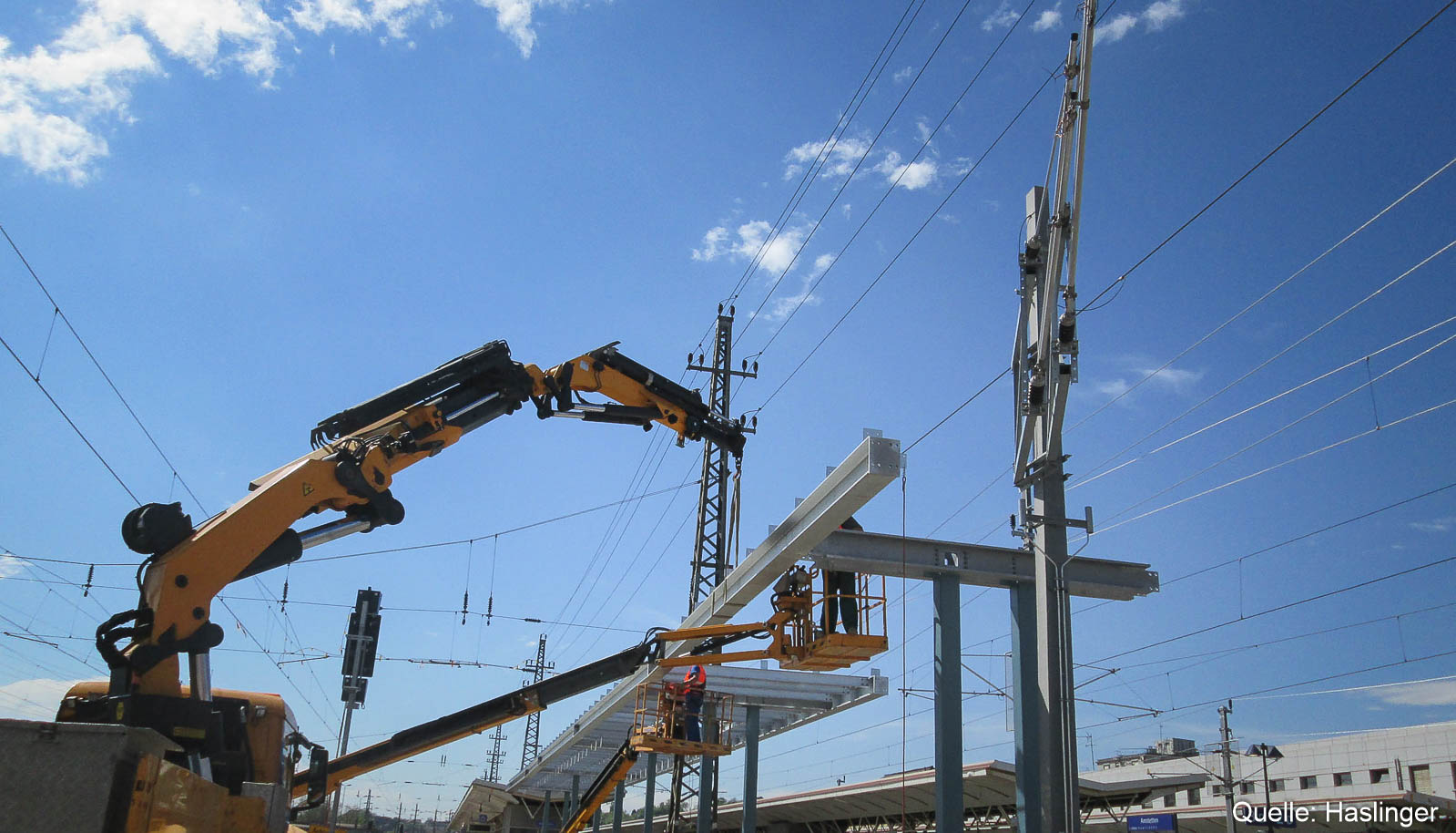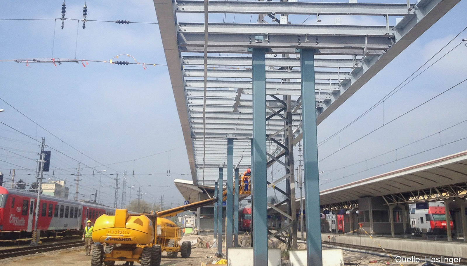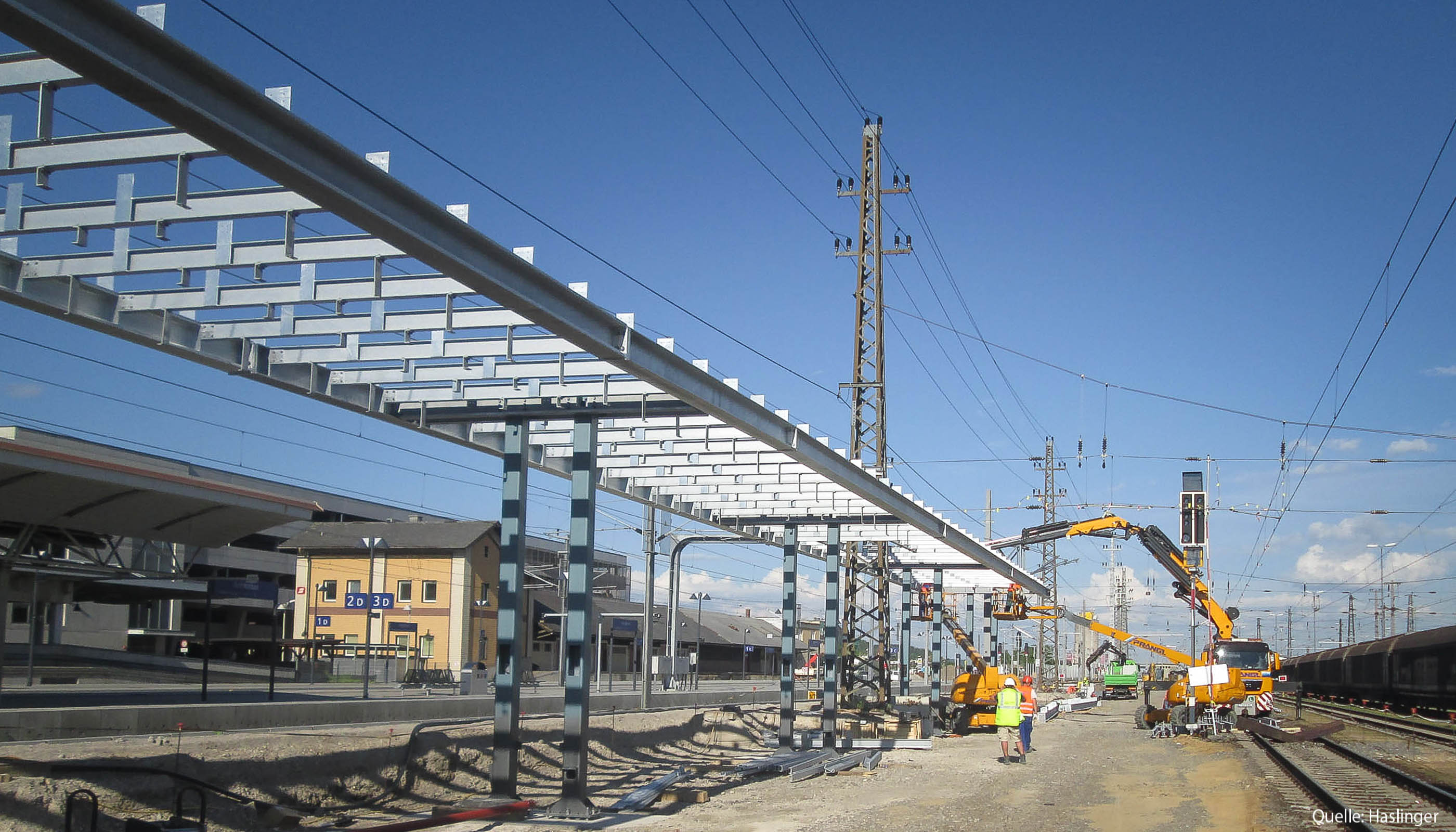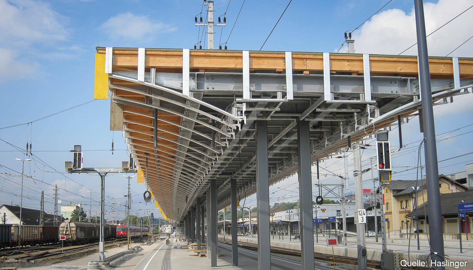 Bei der im Jahr 2015 durchgeführten Adaptierung hat HASLINGER STAHLBAU das bestehende Bahnsteigdach 4/5 um ca. 178 m verlängert. Der Neubau besteht aus 14 Achsen, also 13 Feldern zu je 13,20 m sowie 2 Auskragungen an den Dachenden zu ca. 2,5 m bzw. ca. 5 m. Im Bereich des neuen Bahnsteigdaches stehen 5 Masten, die mittels Auswechslungskonstruktionen durch das Dach geführt werden. Das Bahnsteigdach ist im Grundriss gebogen und hat parallel zu den Schienen ein Längsgefälle über die gesamte Länge.