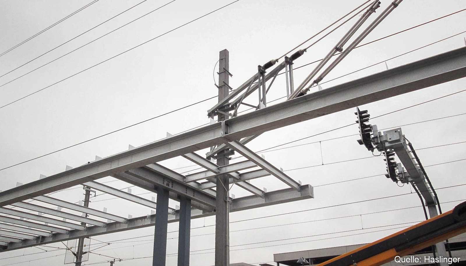 Die Ober- bzw. Spitzenleitungen blieben während der gesamten Montagezeit stromführend. Aufgrund dieser Erschwernisse musste der Stahlbau mittels LKW mit Ladekran (Hiab) innerhalb minutengenau getakteten Oberleitungsabschaltungen montiert werden. Die Passgenauigkeit der vorgefertigten Bauteile musste zu 100 % gegeben sein, da nur in den Abschaltzeiten montiert werden durfte.