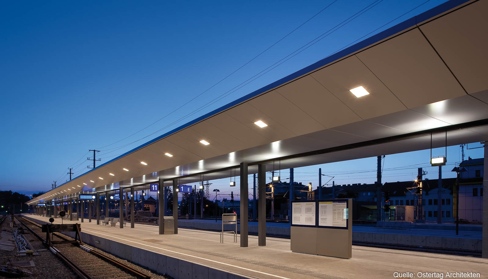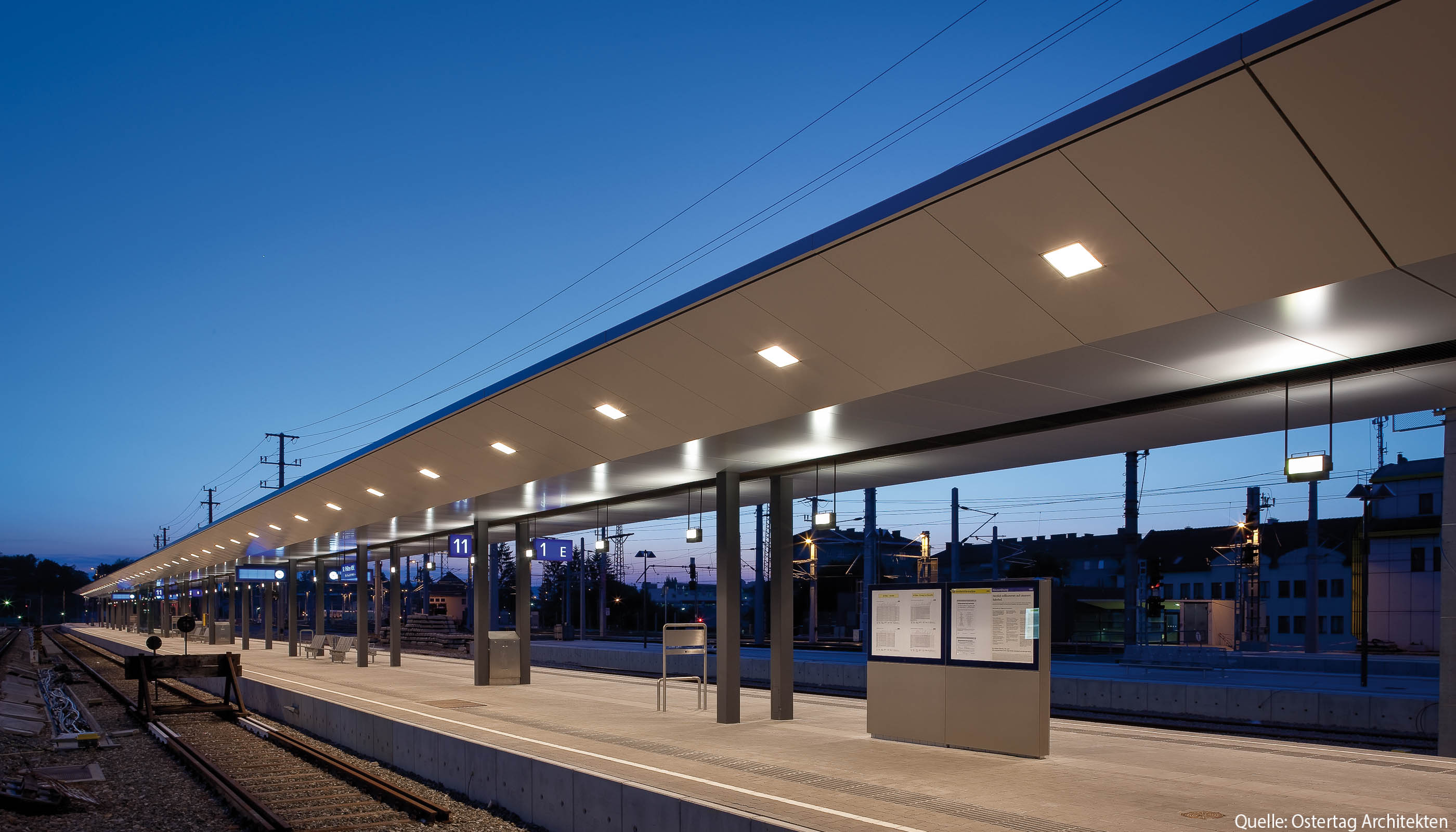 In den Jahren 2008 - 2010 wurden in St. Pölten ca. 10.000 m² Bahnsteigdächer neu errichtet. HASLINGER STAHLBAU lieferte neben den tragenden Stahlkonstruktionen das komplette Paket der Bahnsteigüberdachungen mit Dacheindeckung und Untersichtsverkleidung aus Aluminiumverbundplatten. Im Leistungsumfang waren darüber hinaus die Bahnsteigausstattungen, bestehend aus Wartekojen, Lifteinhausungen, Stiegenaufgängen inkl. Reinigungswagen, Infovitrinen sowie die Abhängekonstruktionen für das Wegeleitsystem und die Videoüberwachungen enthalten.