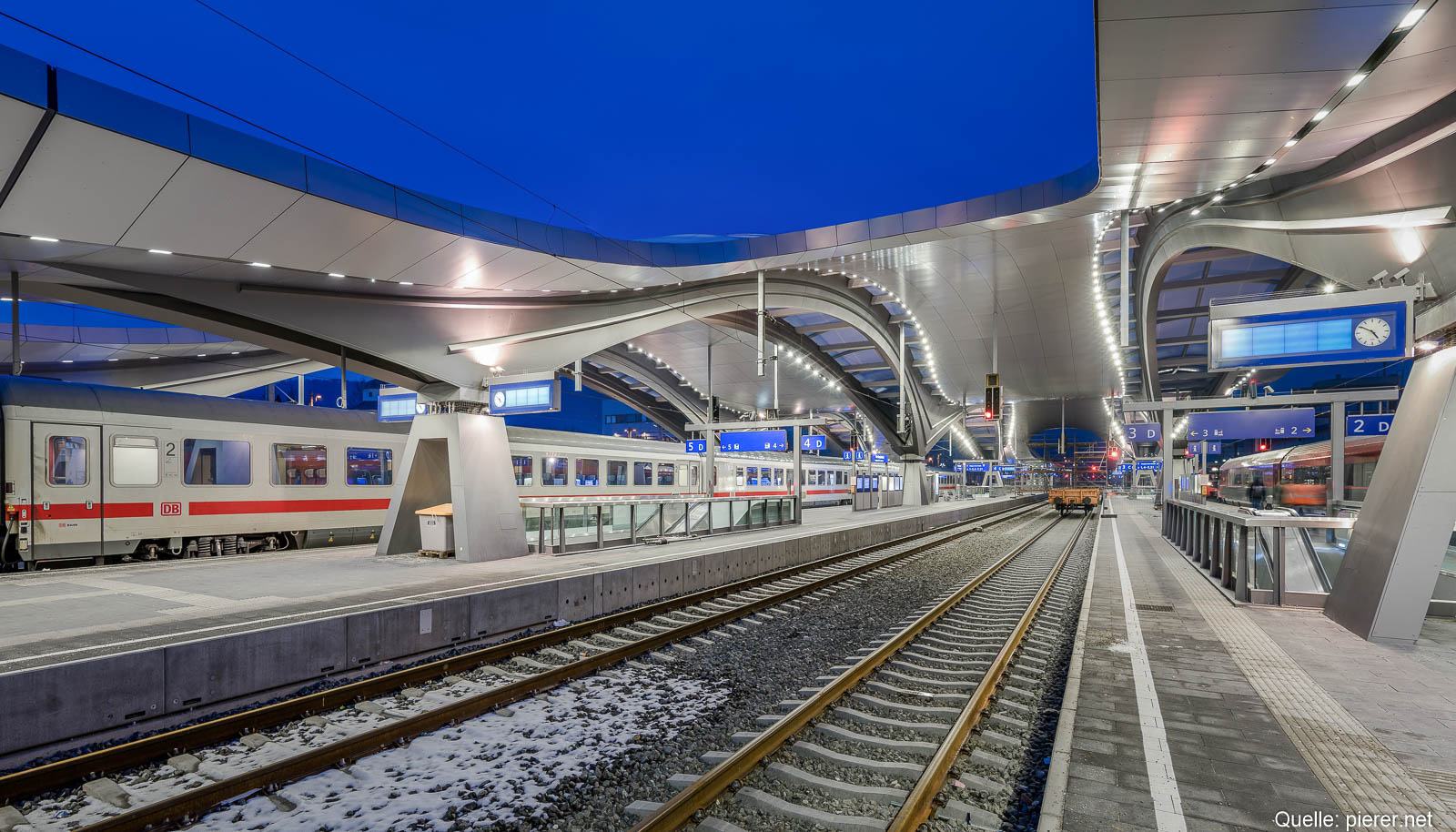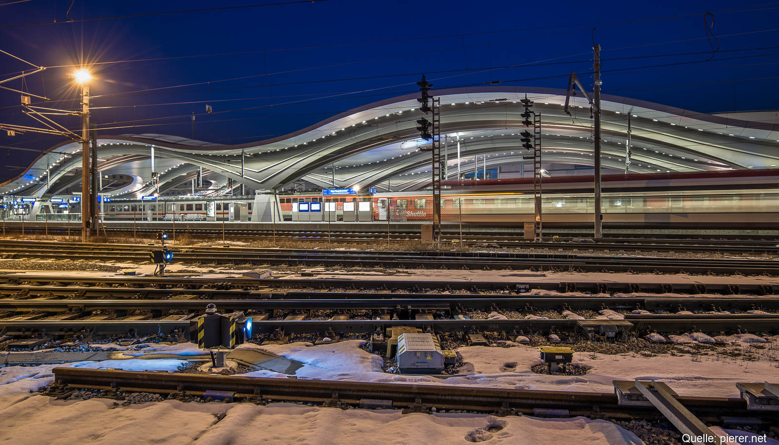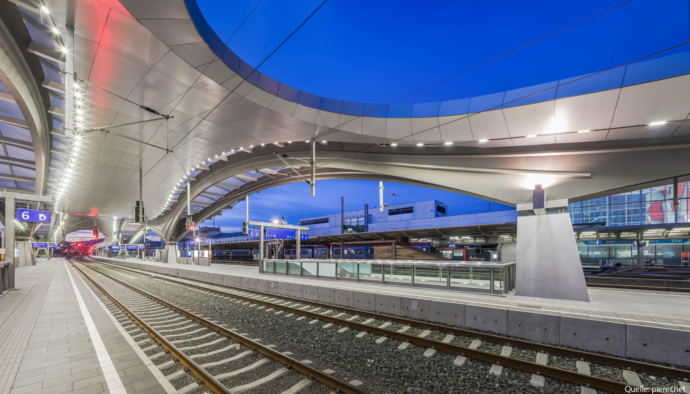Ein bauliches Highlight stellt das wellenförmige Dach dar, welches im Bereich der Inselbahnsteige errichtet wurde und diese überspannt. Bei den Stahldächern handelt es sich um über 40 m freigespannte wellenförmige Tragwerke. Eine besondere Herausforderung für die Monteure war das passgenaue Justieren der Bauteile auf der eigens dafür errichteten Montagehilfskonstruktion. Die geometrisch aufwändigen Bauteile wurden auf der Baustelle zu einem Gesamttragwerk zusammengefügt und verschweißt. Der Umstand, dass die Dachkonstruktion unter ständigem Bahnbetrieb hergestellt werden musste, verschärfte die Anforderungen an die Baustellenlogistik.