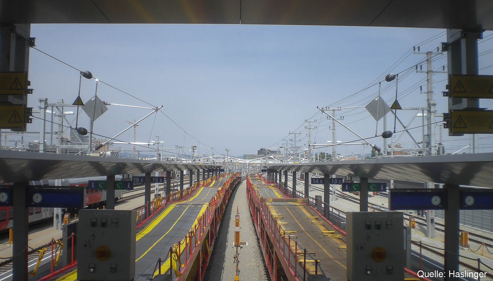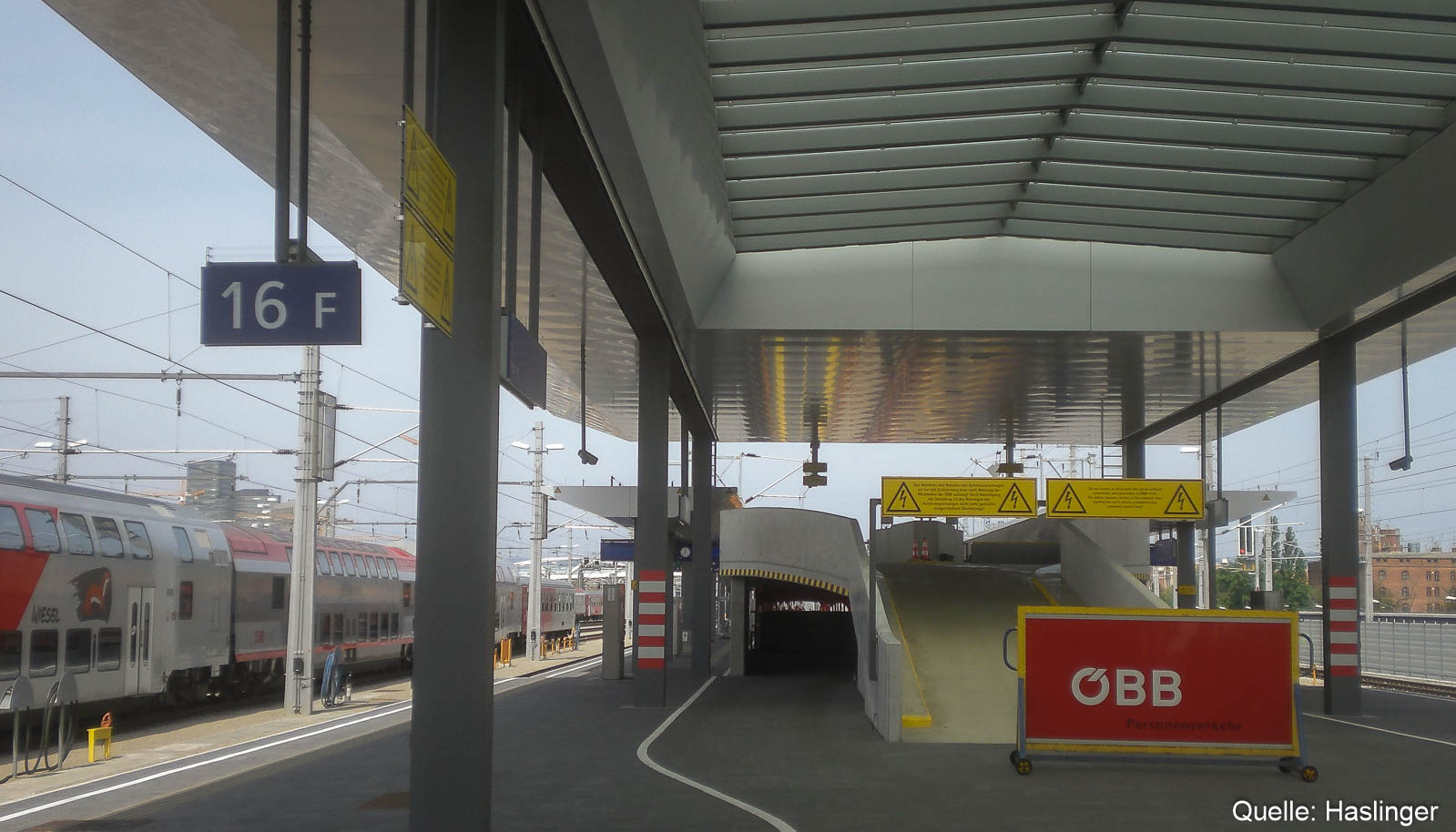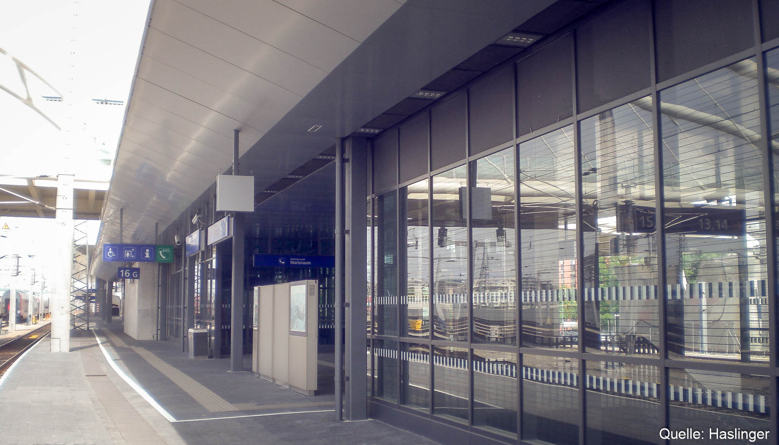 Auf einer Länge von 326 m errichtete HASLINGER STAHLBAU die Bahnsteigdächer inkl. der Dacheindeckungen und der Aluminiumverbundplatten-Untersichtverkleidung, das Wegeleitsystem und die Ausbauelemente aus Edelstahl und Glas. Des weiteren umfasste der Leistungsumfang von HASLINGER STAHLBAU die Errichtung des Flugdaches am Vorplatz, den Aufgang- bzw. Zufahrtsbereich sowie die Dach- und Wandbekleidungen des Personal- und Technikgebäudes und der Trafostationen im Bereich der Bahnanlage.