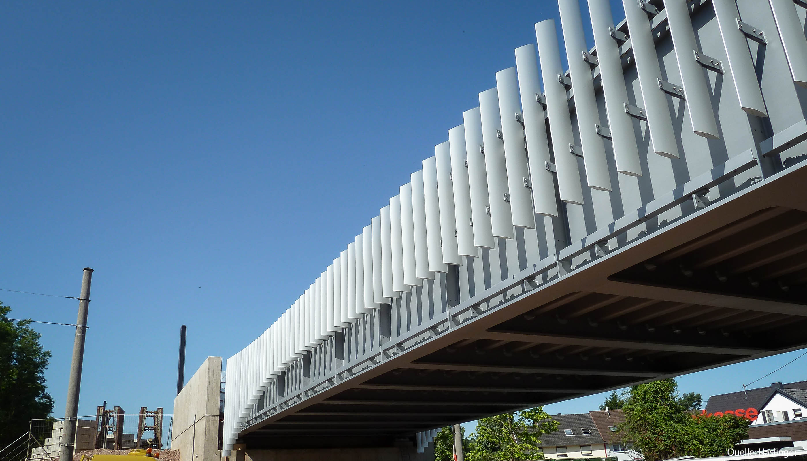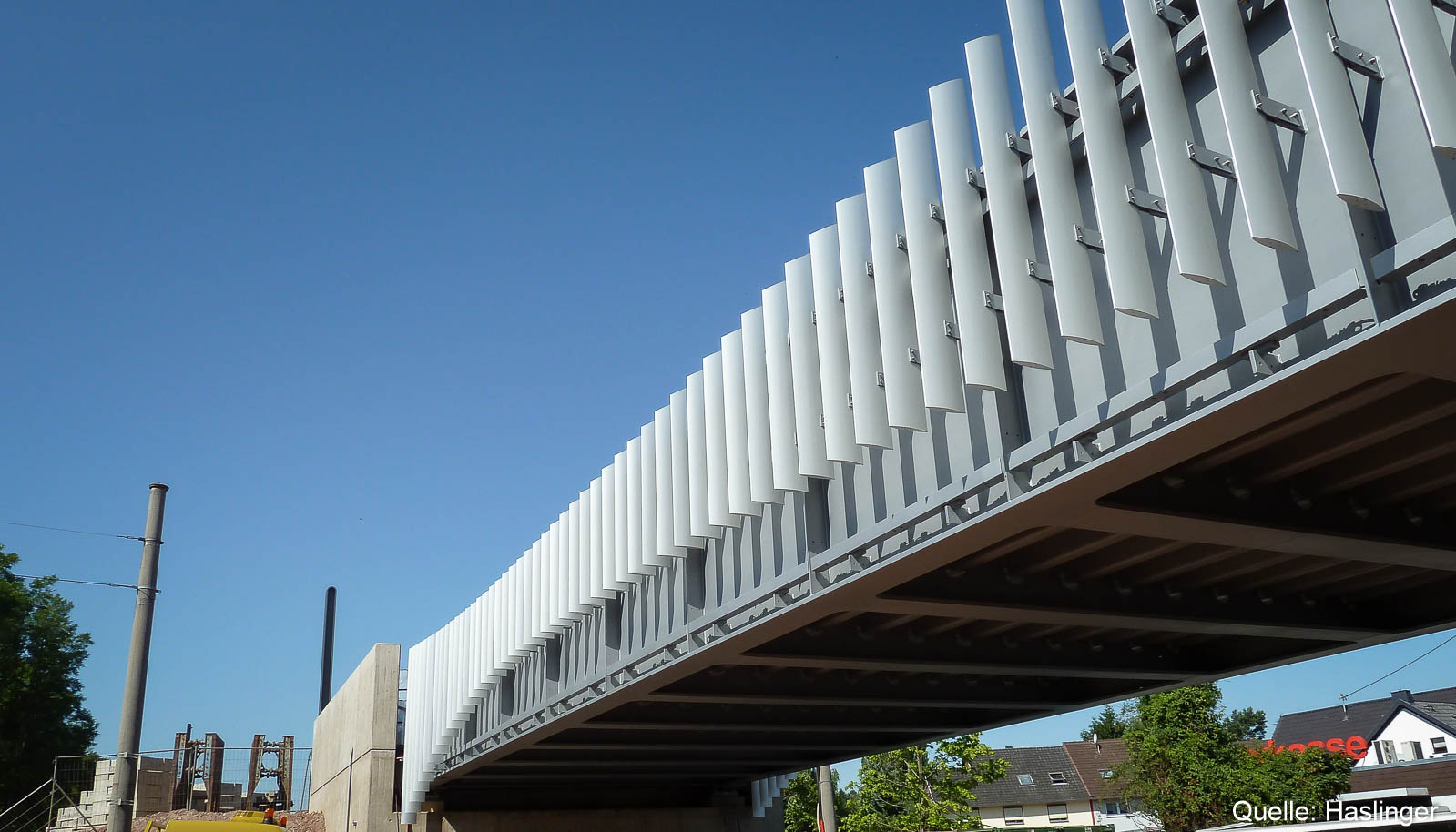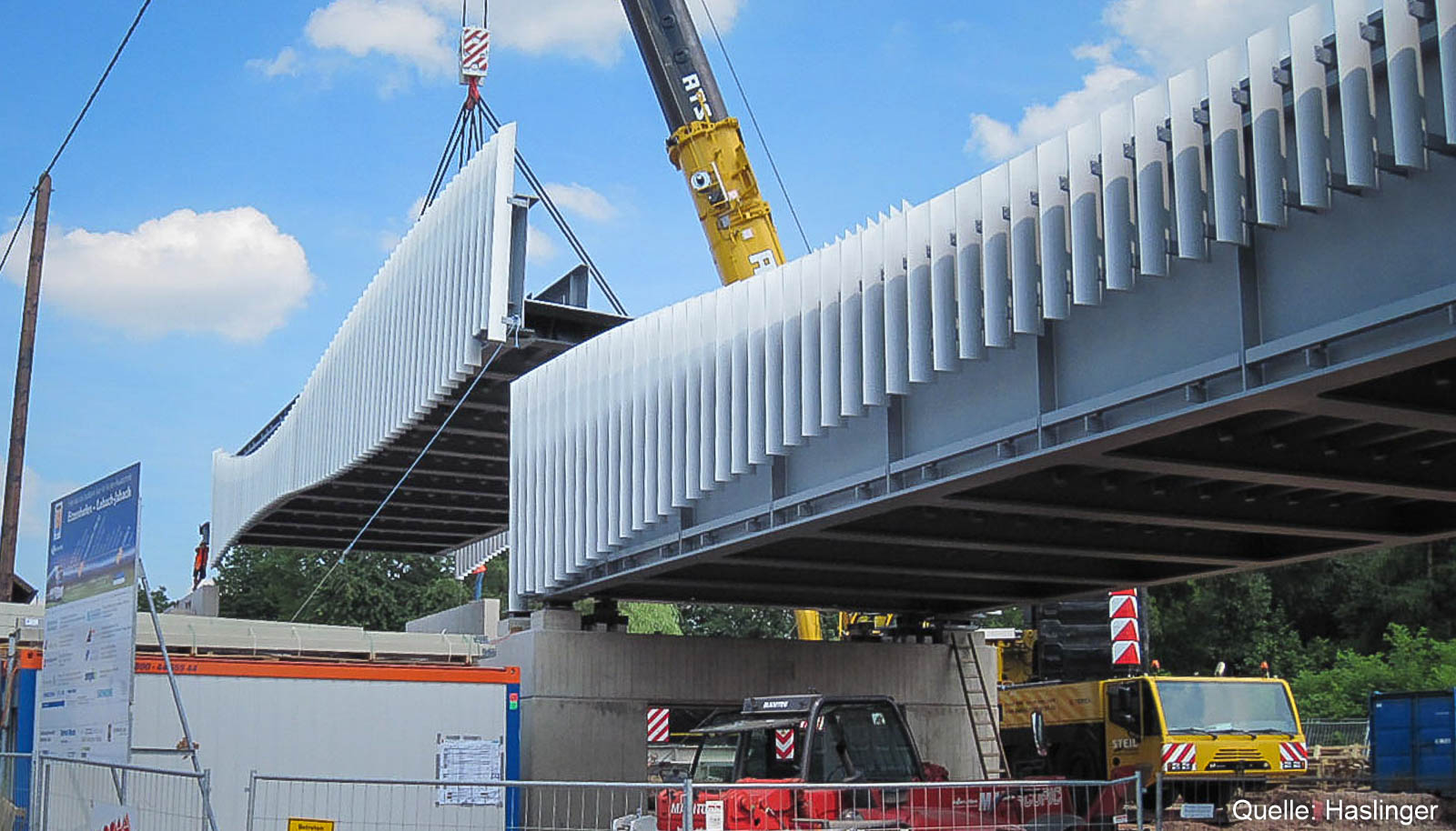 Engste Platzverhältnisse und kurze Terminabläufe erforderten genaueste Montageplanung und großes Stahlbau-Knowhow. Die beauftragten Leistungen schlossen außer dem Konstruieren, Fertigen und Montieren des Stahlüberbaues auch den gesamten Korrosionsschutz, die Brückenlager, die Fahrbahnübergänge, die innenliegenden Lärmschutzwände sowie die zur optischen Gestaltung gewählten Alu-Lamellen mit ein.