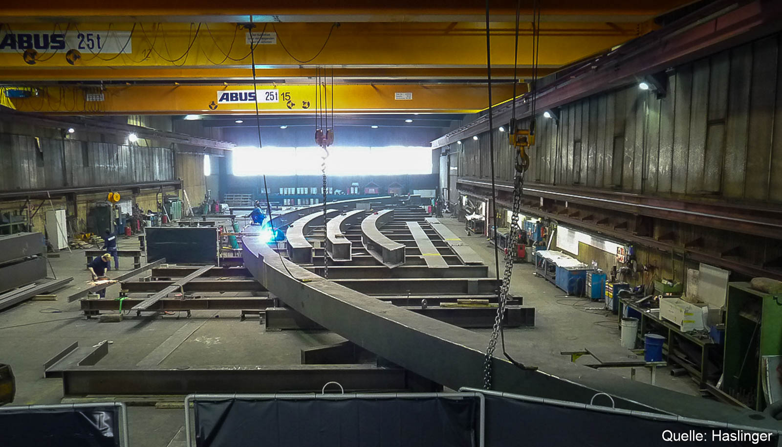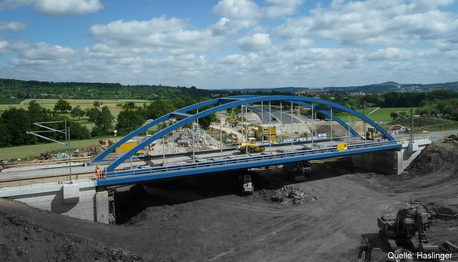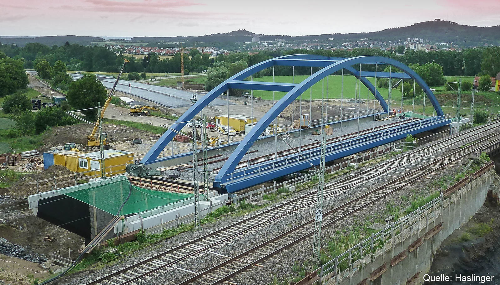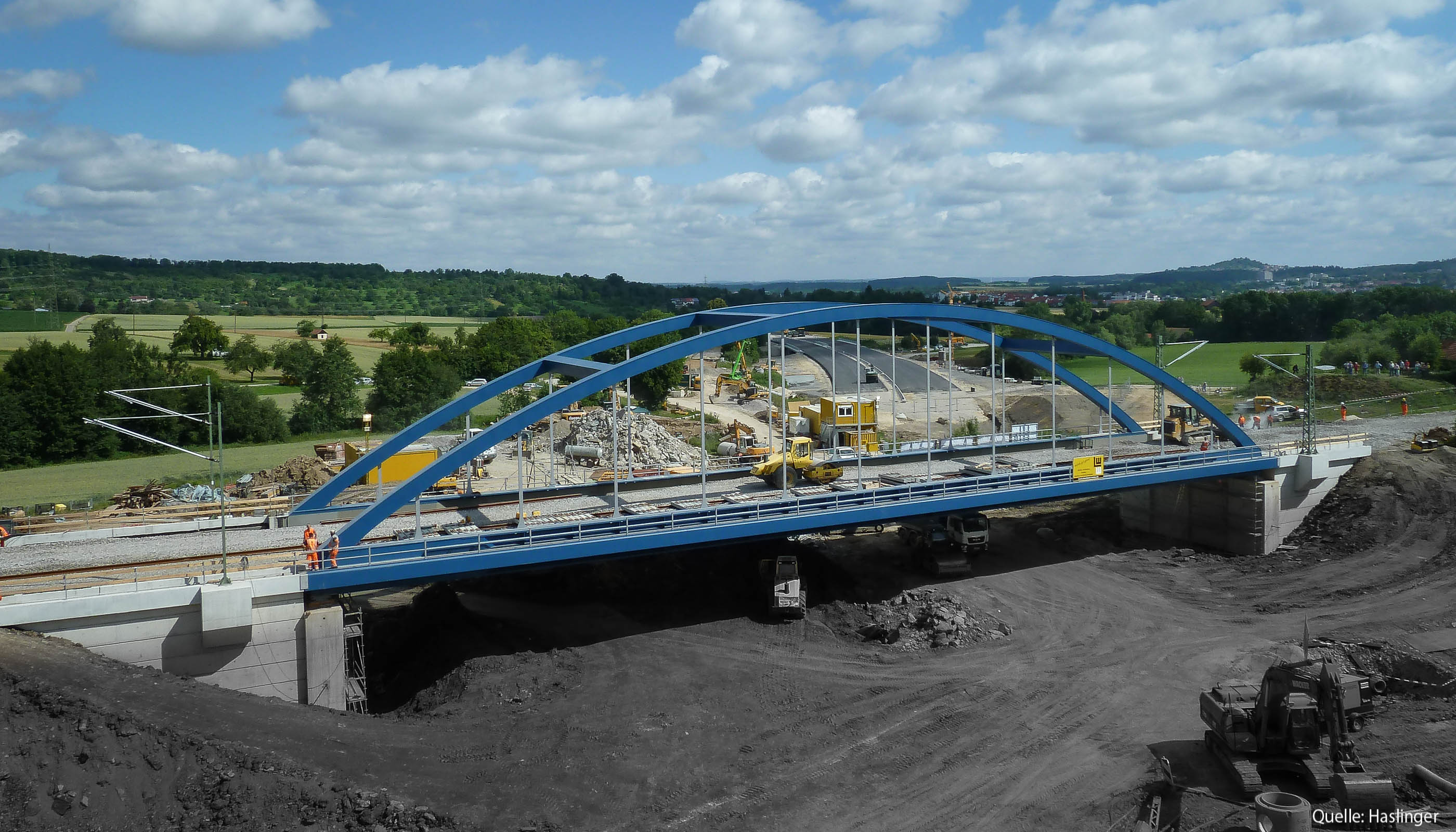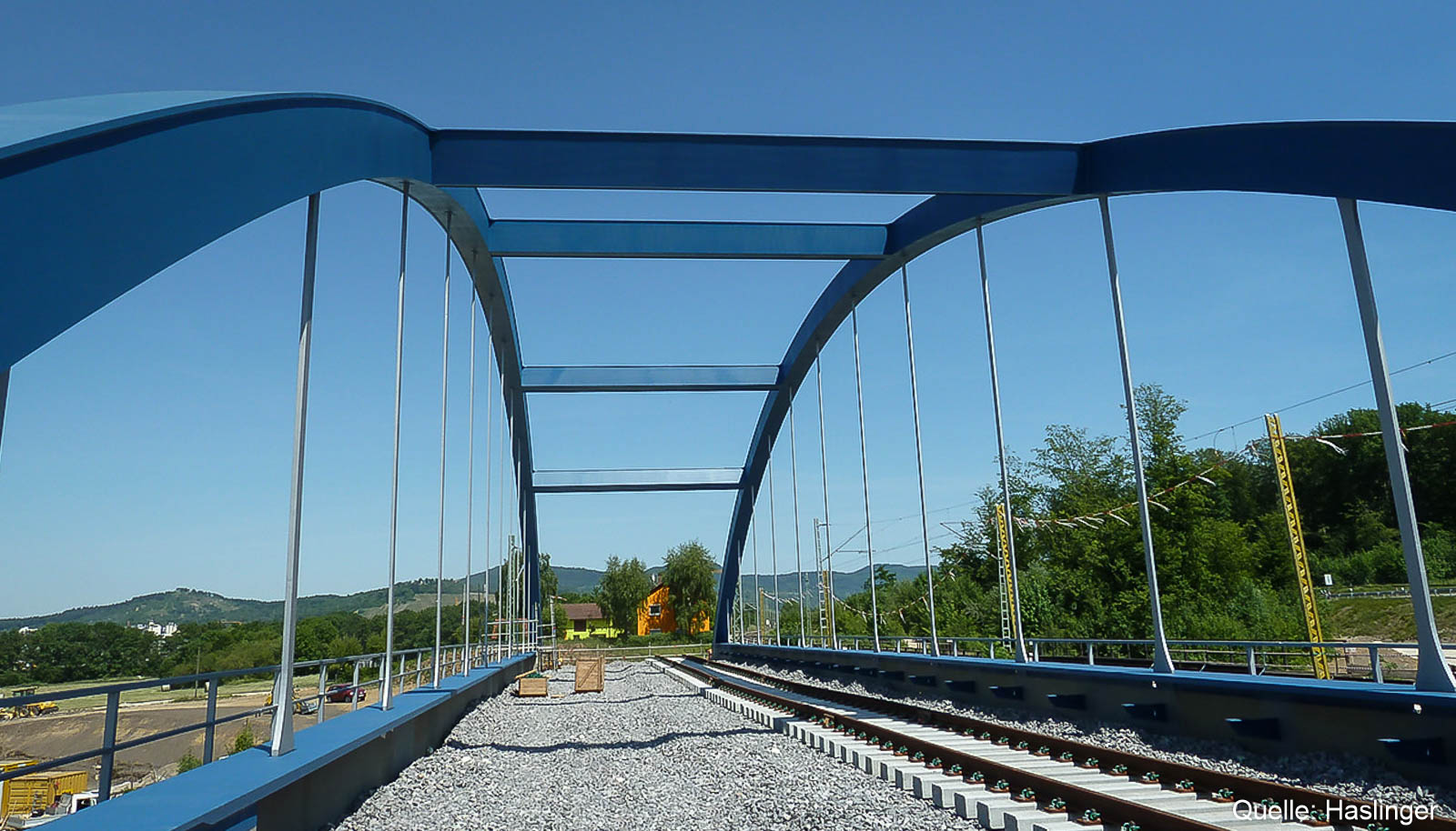 Der Bauherr, die DB Netz AG, entschied sich für eine Stabbogenbrücke mit orthotroper Fahrbahnplatte. HASLINGER STAHLBAU lieferte und montierte die Stahlkonstruktion in gewohnter Qualität und Zuverlässigkeit.