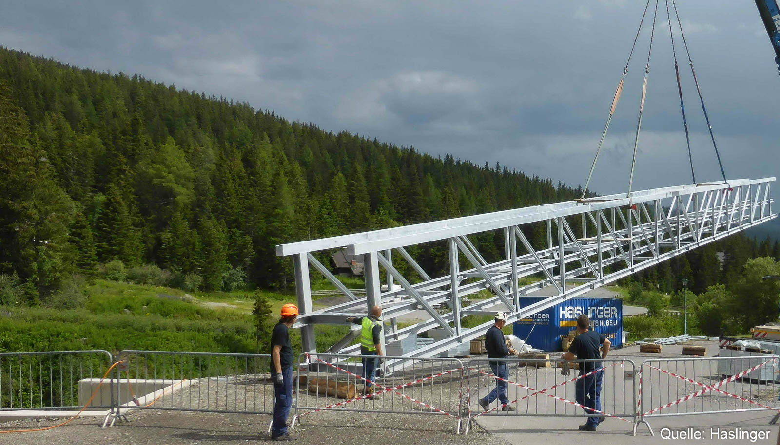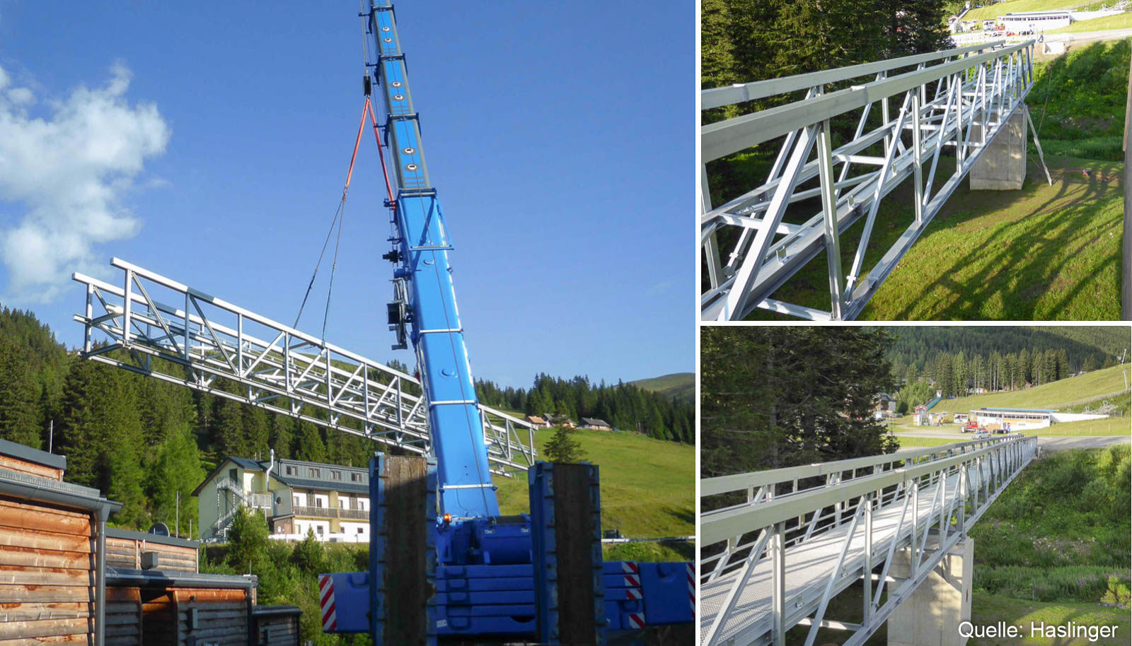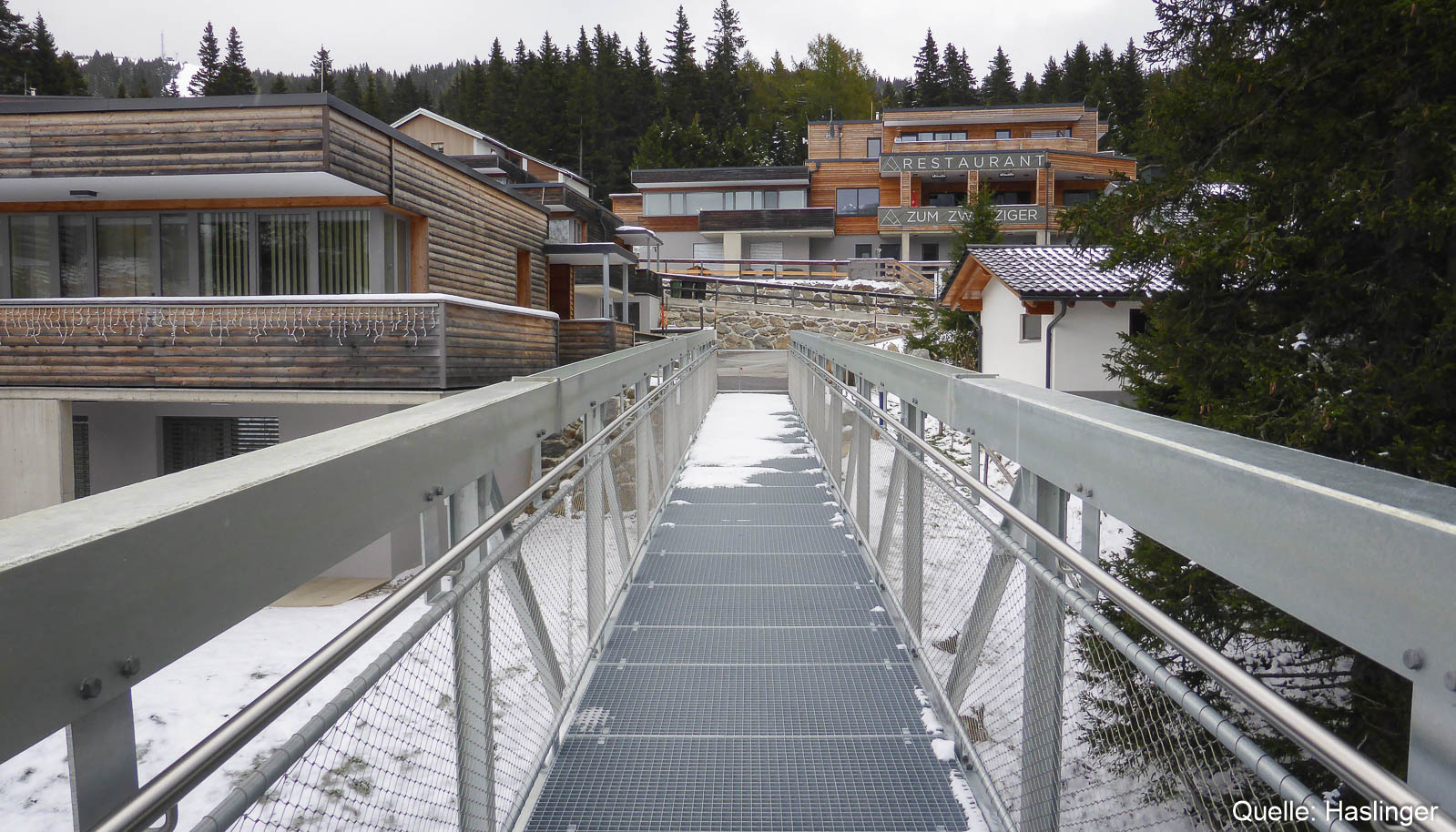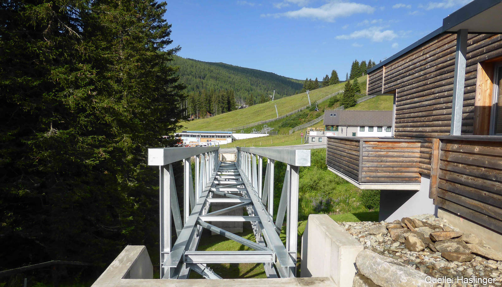 Die Fußgängerbrücke wurde im Auftrag der Fides Immobilien GmbH im Ski- und Wanderparadies Lachtal in der Steiermark errichtet. Sie dient als direkte Anbindung einer komfortablen Apartmentanlage mit Restaurant an die Liftanlagen des Skigebietes.
