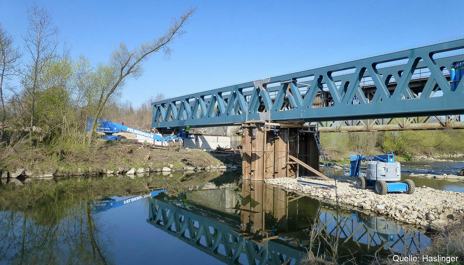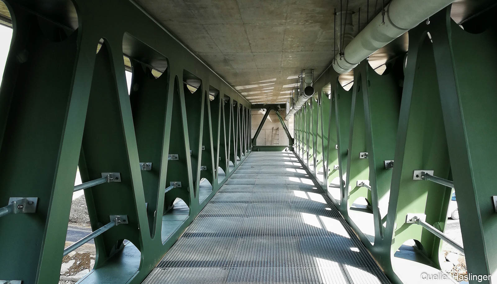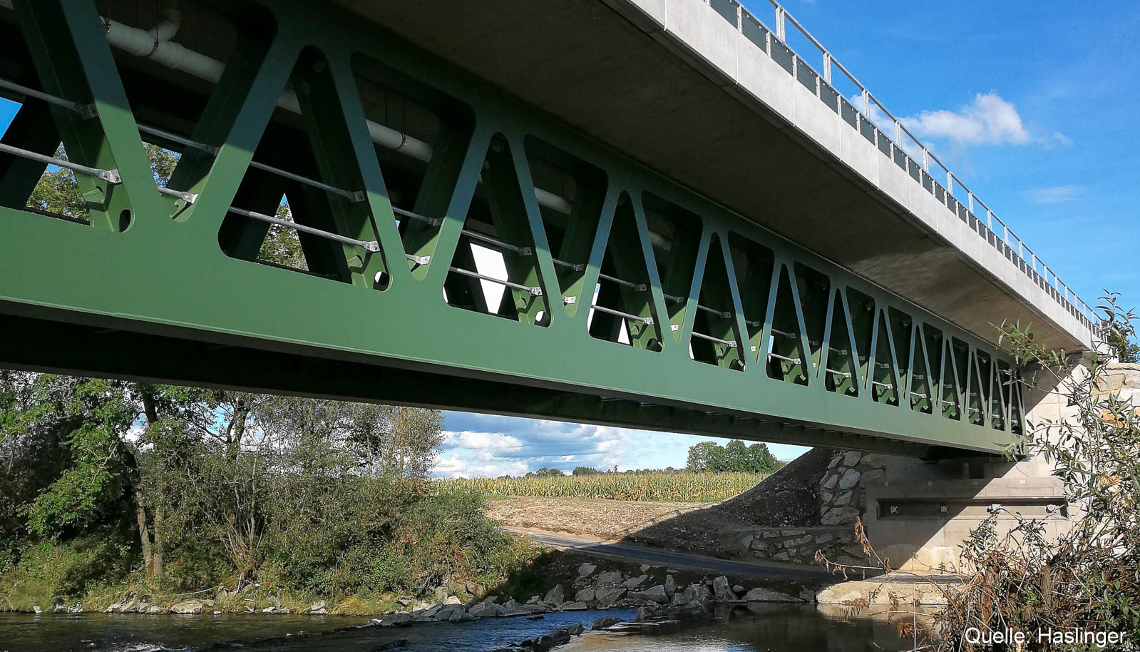 HASLINGER STAHLBAU fertigte diese Brücke in vier Großbauteilen. Diese wurden mittels Sondertransporten an den Einbauort transportiert und mit Großkränen exakt eingerichtet und montiert.