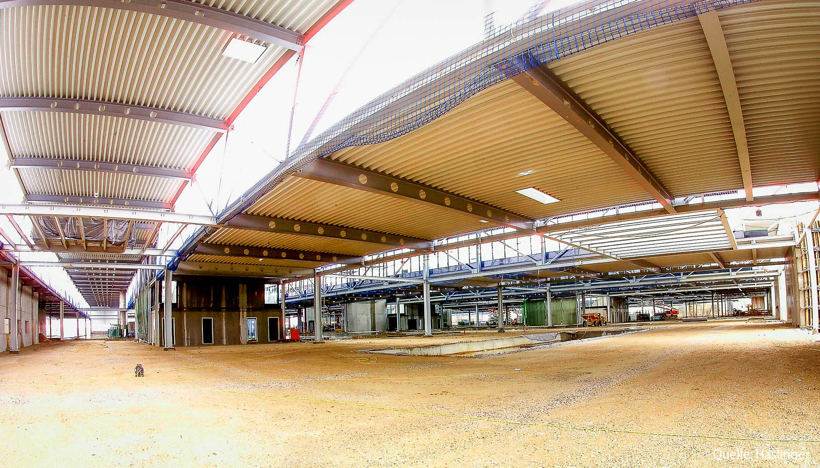 Die Hallenbreite von 216 m unterteilt sich in sechzehn 12-Meter-Felder und in ein 24-Meter-Feld. Die Fachwerke sind zwischen 4,3 und 7,5 m hoch. Durch das Anschließen der Dachbinder quer zu den Fachwerken - einmal am Fachwerksober- und einmal am Fachwerksuntergurt - entstanden zwei Dachebenen bis zu einer Maximalhöhe von 10 m. Der dadurch entstandene Höhensprung sorgt für die optimale Belichtung der gesamten Halle.