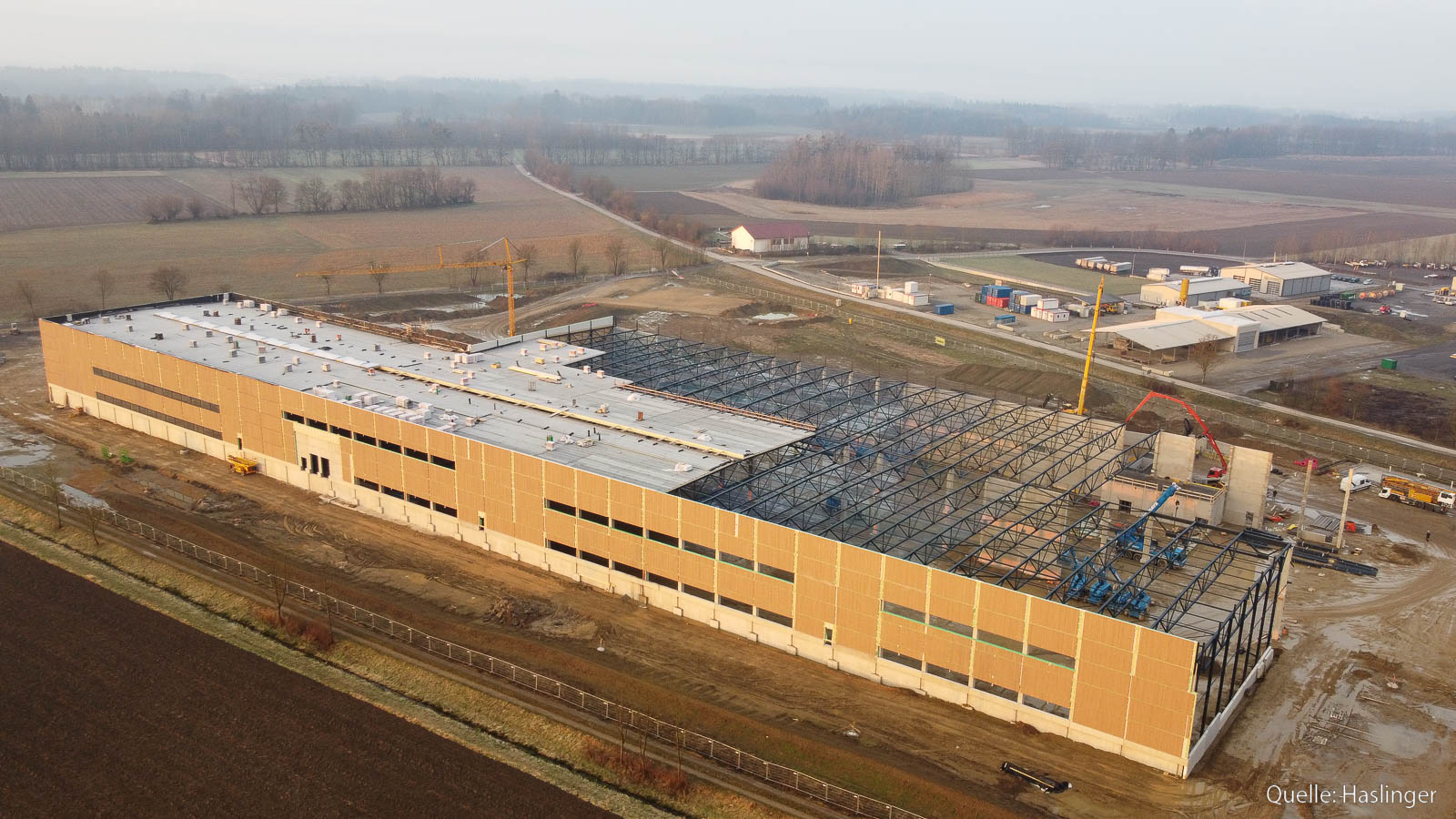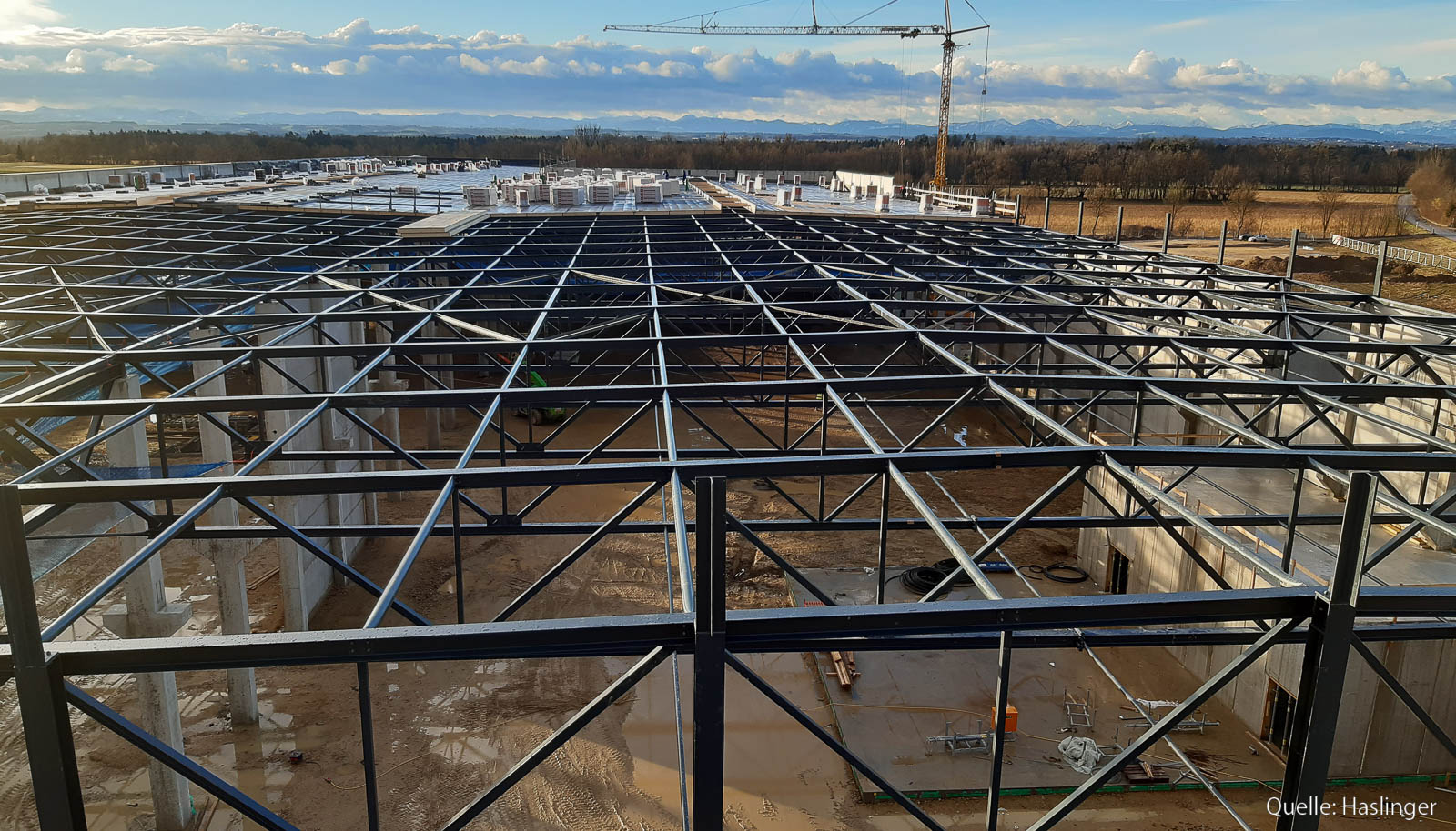 Die mit einem mittigen Montagestoß versehenen Stahlfachwerke spannen stützenfrei über 40 m. Durch die Vermeidung zusätzlicher Unterstützungen kann die Fläche in der Halle optimal genutzt werden. Die Fachwerke wurden bei HASLINGER STAHLBAU im Werk vorgefertigt und mit Sondertransporten an die Baustelle angeliefert. Nach der Vormontage am Baufeld wurden die Teile mit Mobilkränen eingehoben.