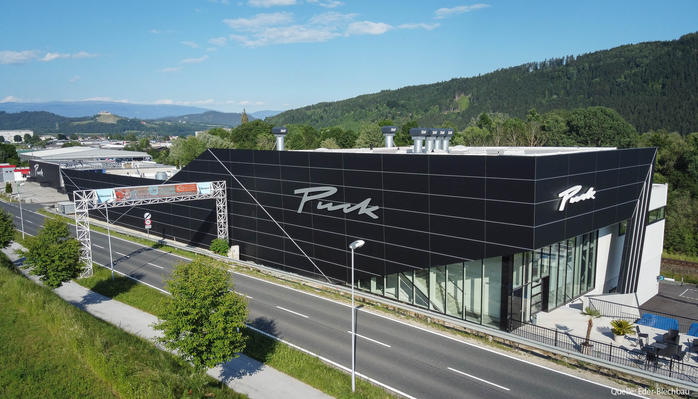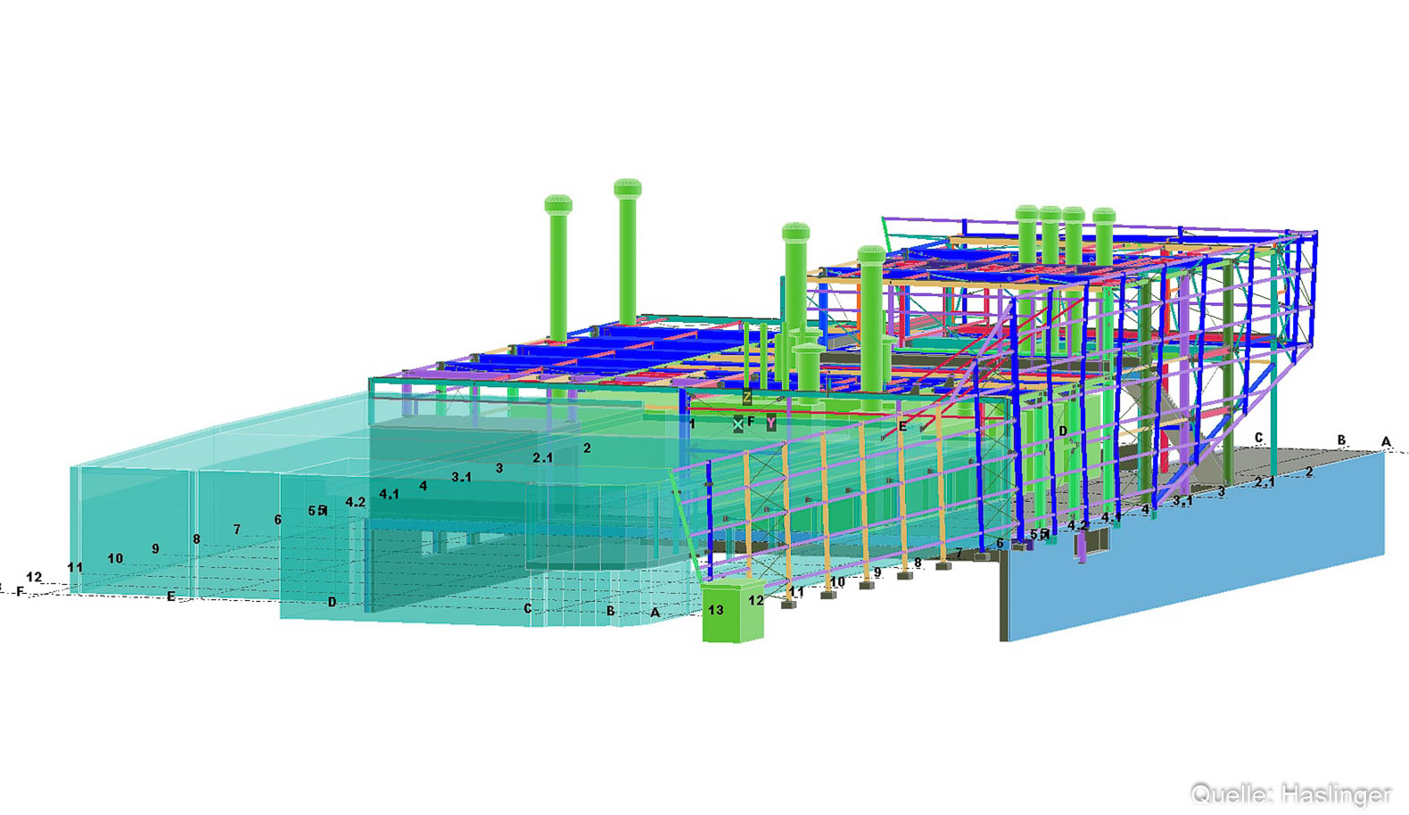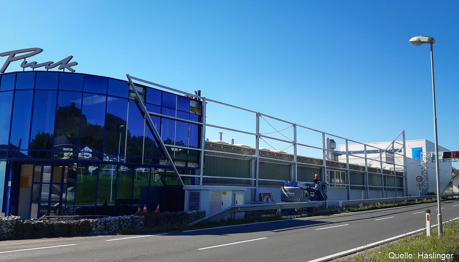 Der Altbestand wurde optisch zusätzlich mit einer Vorsatzschale aus Aluminiumverbundplatten verkleidet und integriert. HASLINGER STAHLBAU lieferte hier die freitragende Stahlunterkonstruktion, die durch diverse Schrägstellungen und Knicke die räumliche Wirkung der Fassadenbekleidung vorgibt.