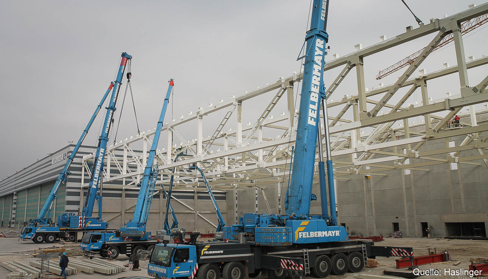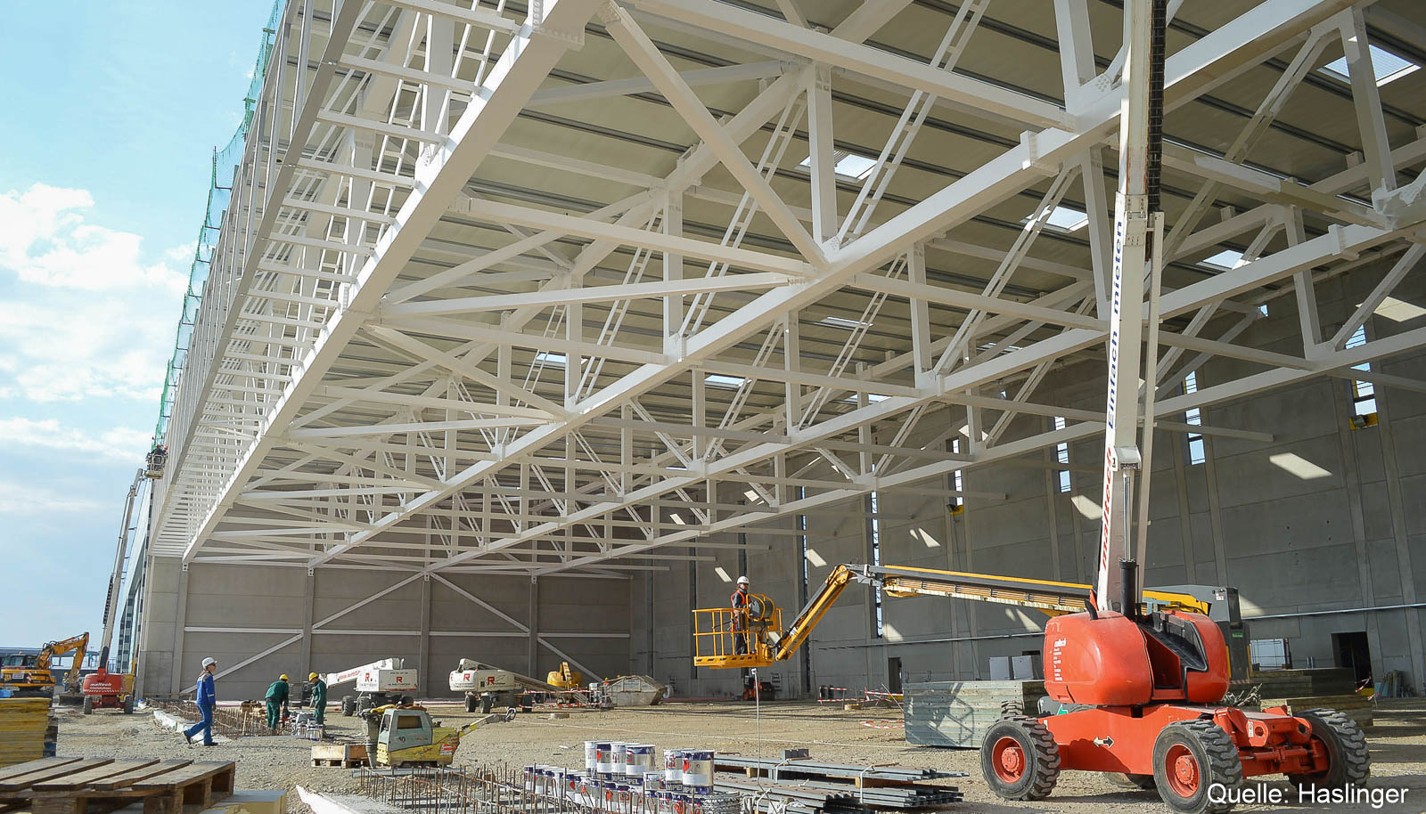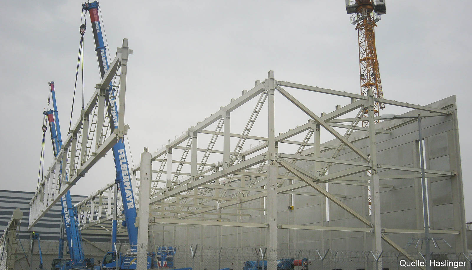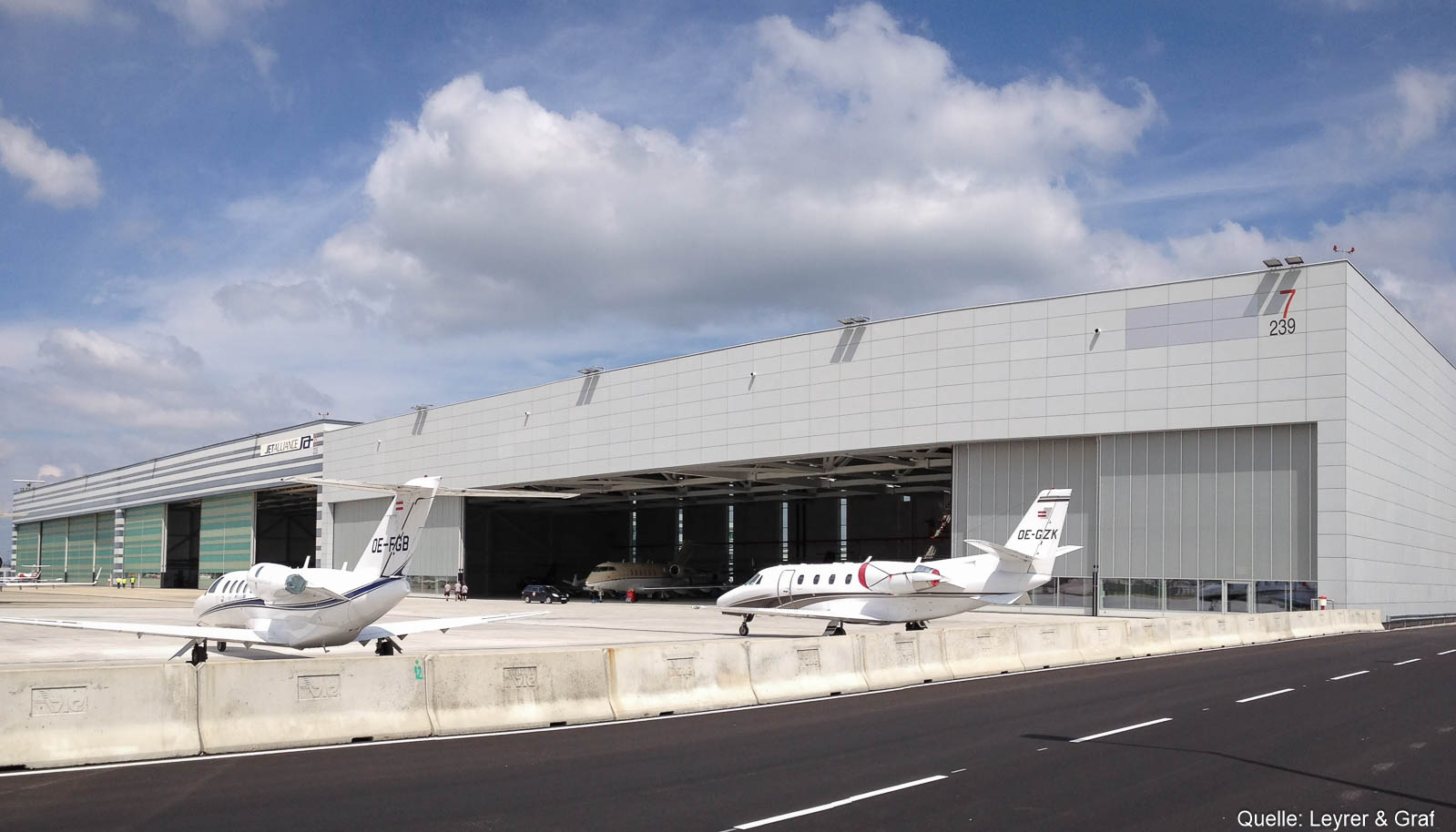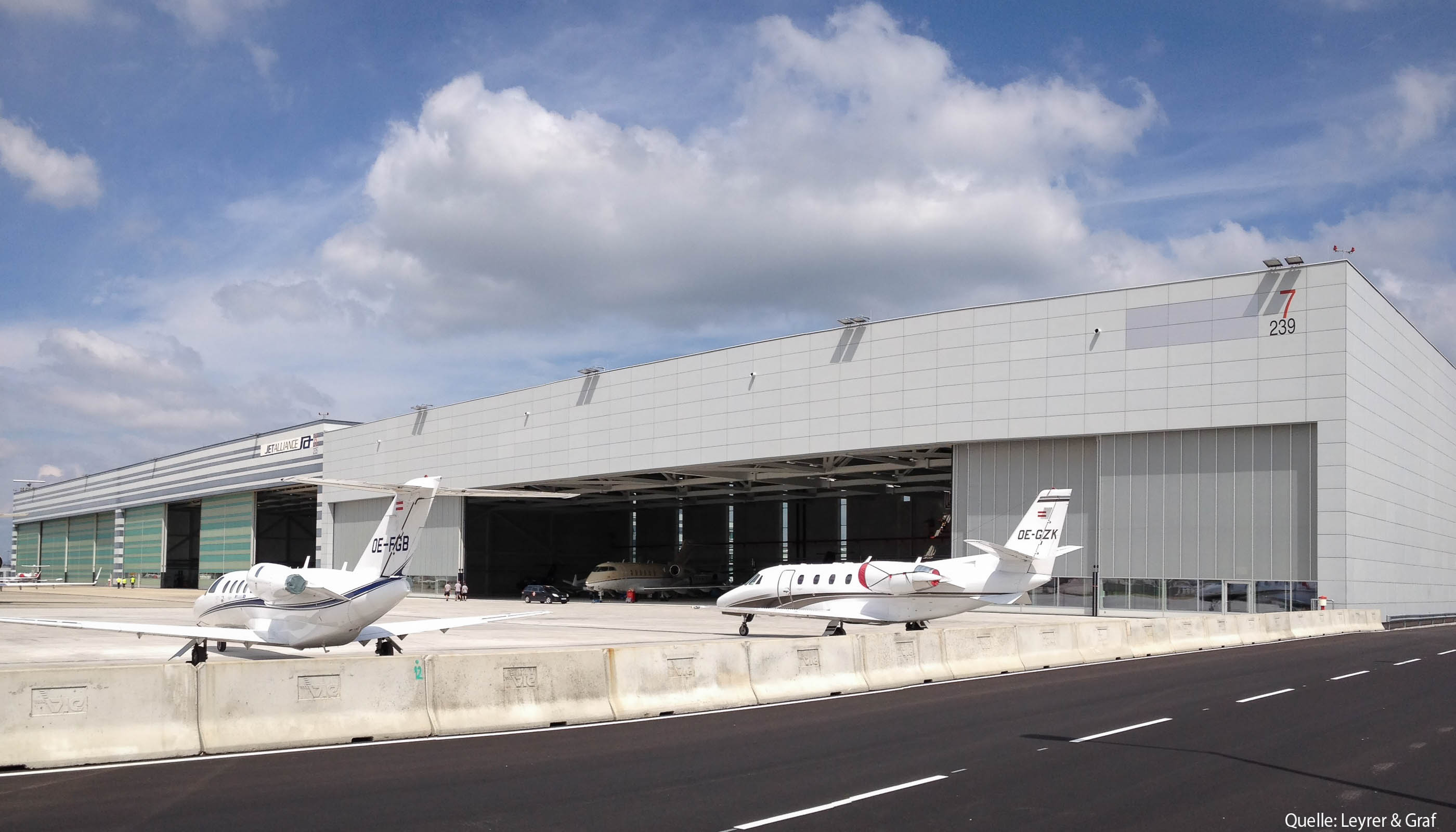 Der Hangar 7 am Wiener Flughafen wurde in einer ARGE zwischen HASLINGER STAHLBAU und Leyrer & Graf realisiert. HASLINGER STAHLBAU zeichnete dabei für die Errichtung des kompletten Stahlbaues, der Dach- sowie Fassadenkonstruktion inkl. Pfosten-Riegelfassade, der Brandrauch-Entlüftung, des Seilsicherungssystems und der Hangartore verantwortlich.