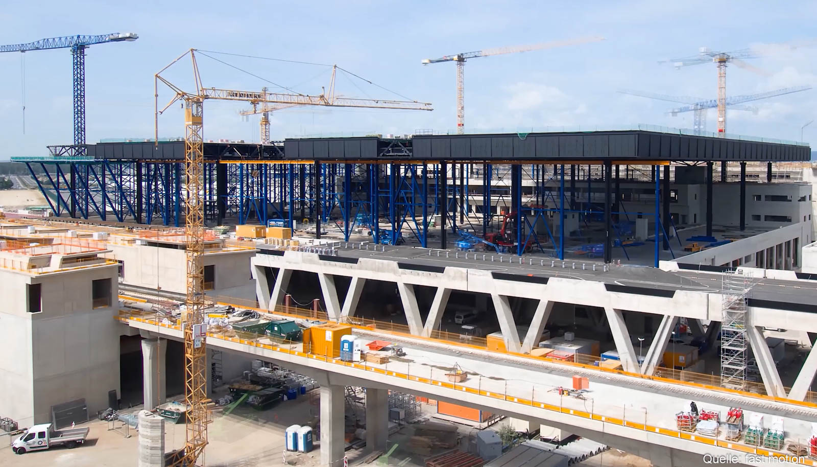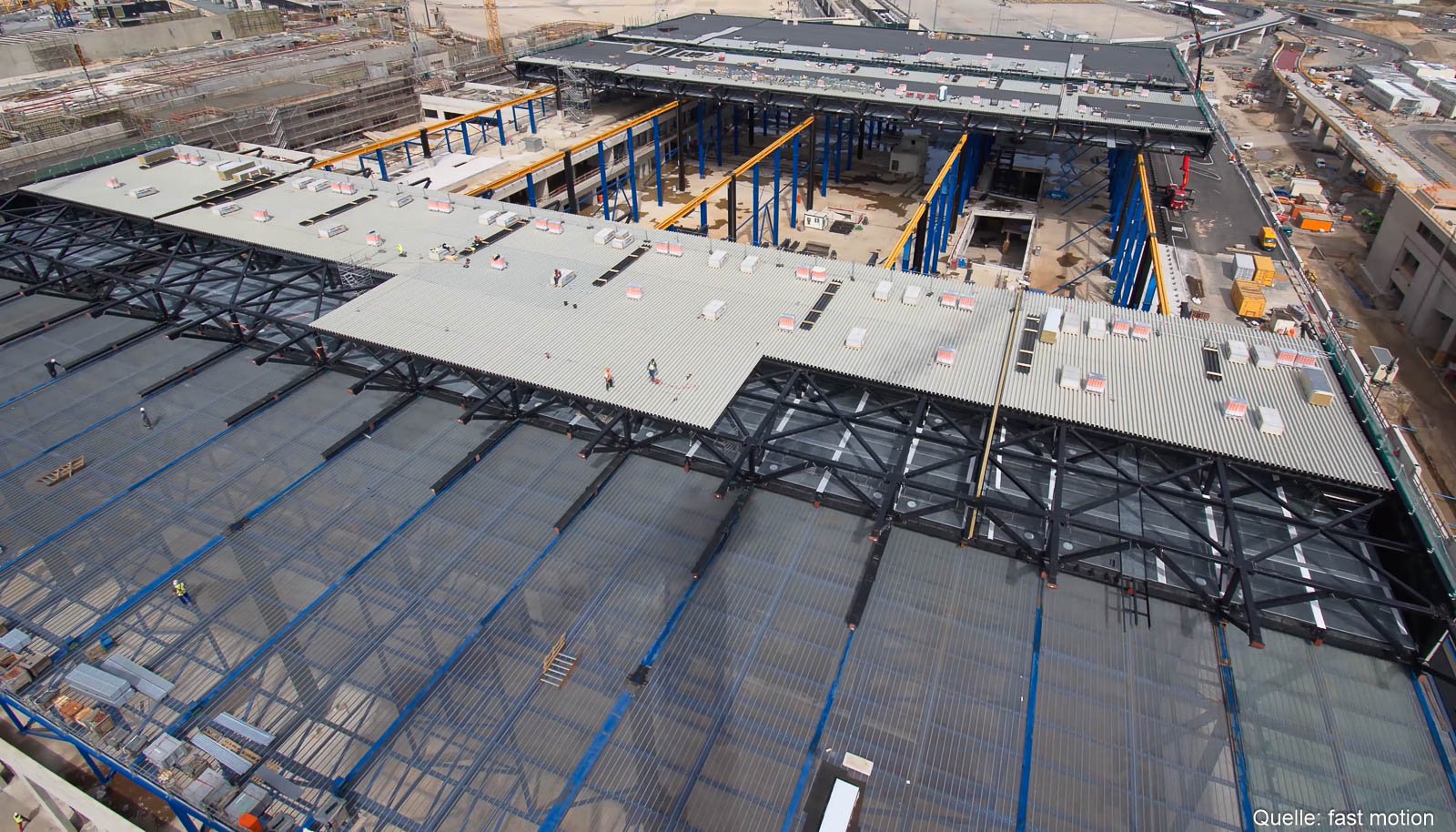 Zur Montage des Dachtragwerkes (DTW) musste aufgrund der erschwerten Zugänglichkeit eine Montageplattform (MoHiKo) errichtet werden. Auf dieser wurde die komplette Stahlkonstruktion montiert und in 5 Segmenten in West-Ost-Richtung über 200 m in ihre endgültige Position gezogen. Auch die im Tragwerk liegende Gitterrostebene sowie das Trapezblech inkl. Notabdichtung wurden bereits auf der Plattform montiert. Die äußerst druckempfindliche Stahlunterkonstruktion der Glasfassade musste mit sehr engen Toleranzen und höchster Genauigkeit gefertigt werden.