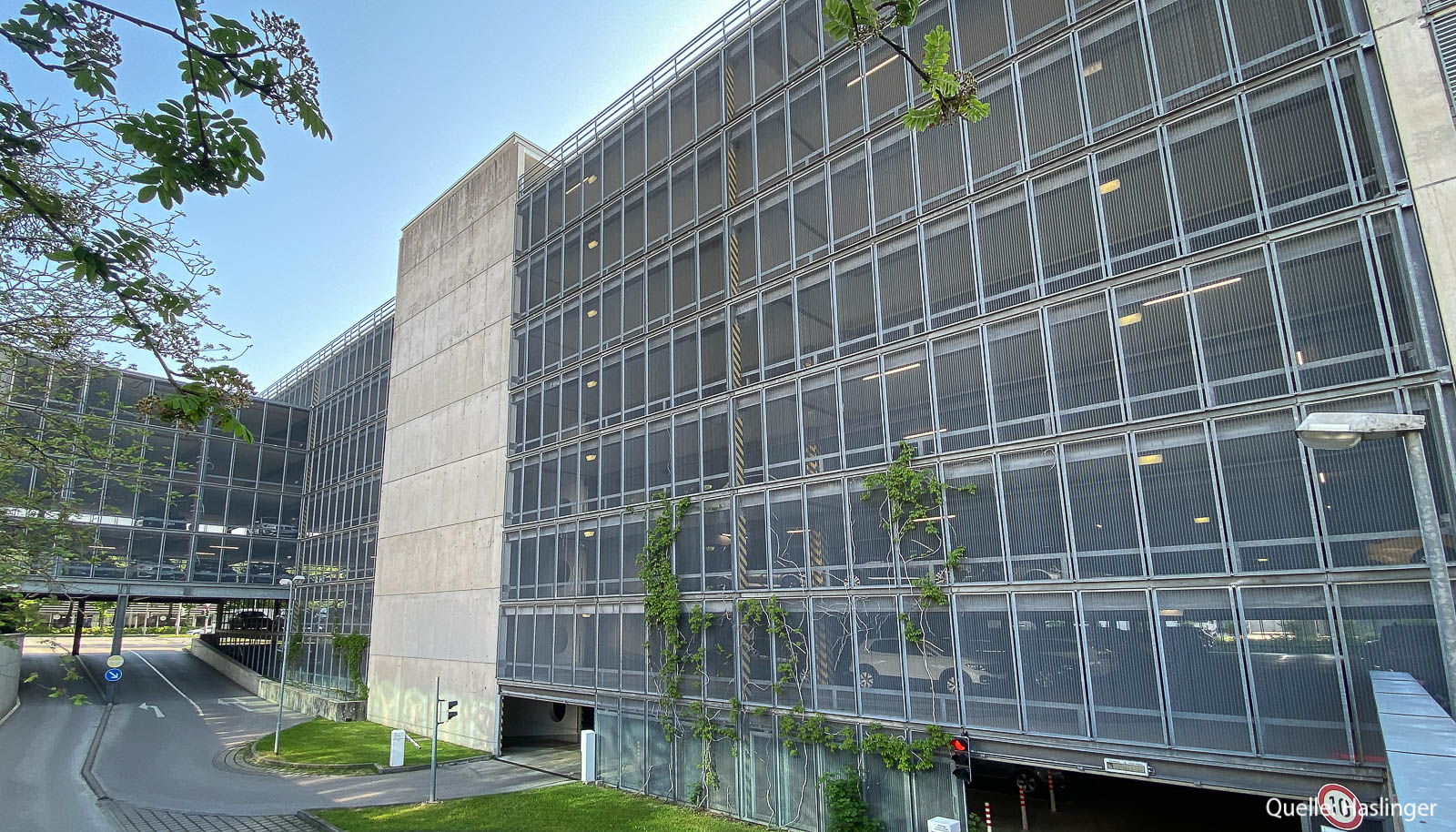 Die verzinkte Verbundkonstruktion wurde von HASLINGER STAHLBAU geplant, geliefert und montiert. Wie in Deutschland üblich wurde auch dieses Parkhaus in der Feuerwiderstandsklasse F0 ausgeführt. Die vorgegebene Anzahl an Stellplätzen wurde auf 7 Geschoßen in 14 Parkebenen verteilt.