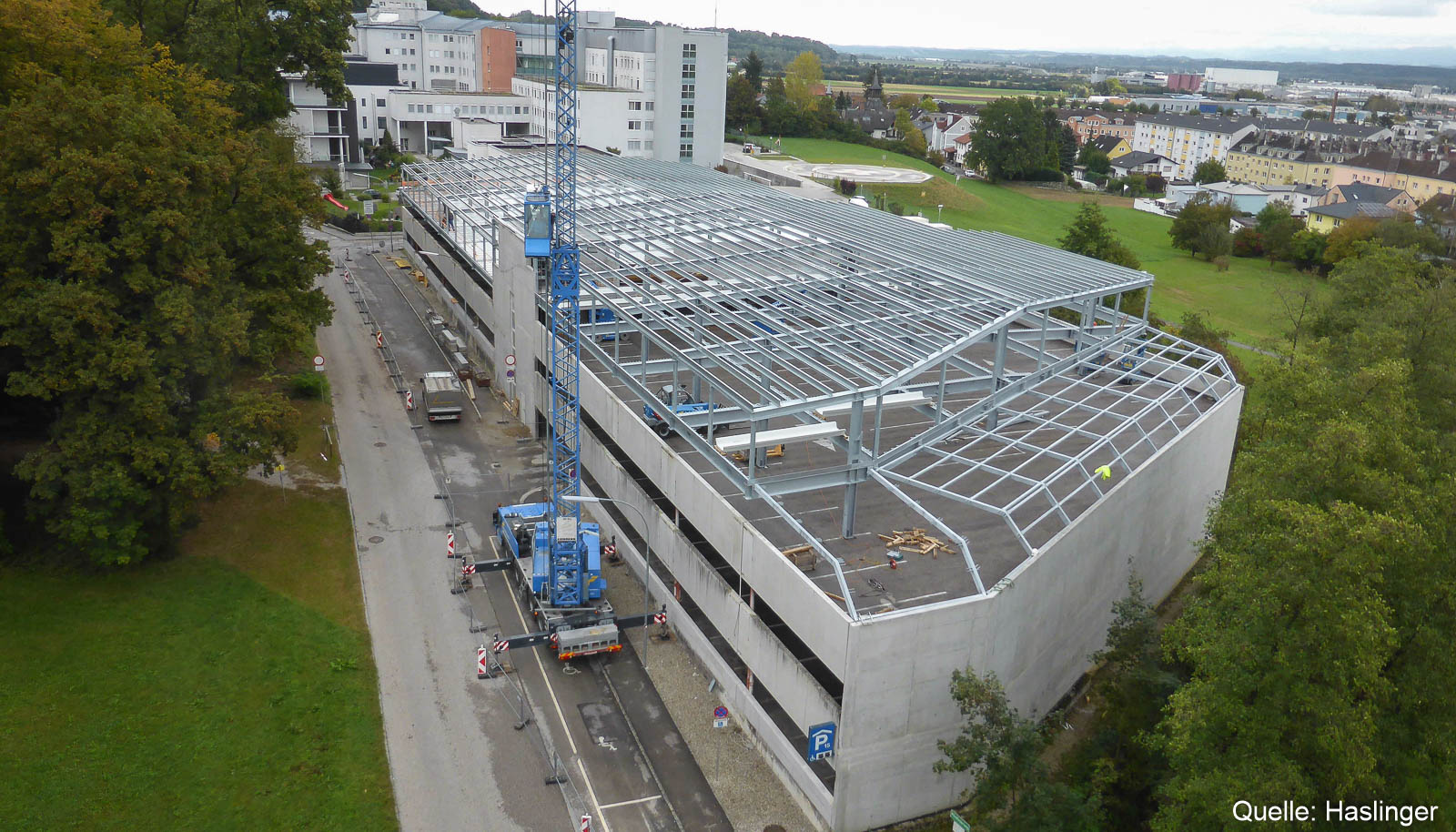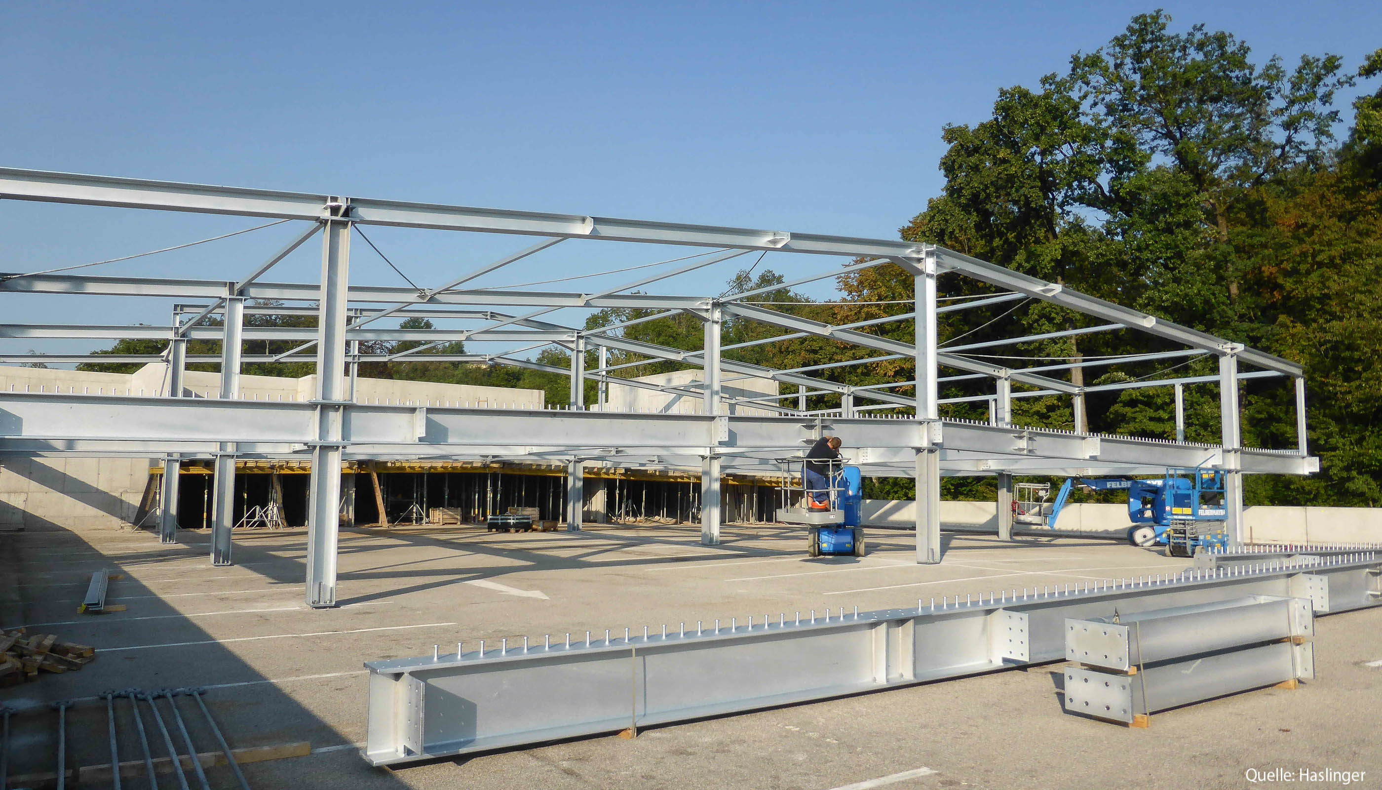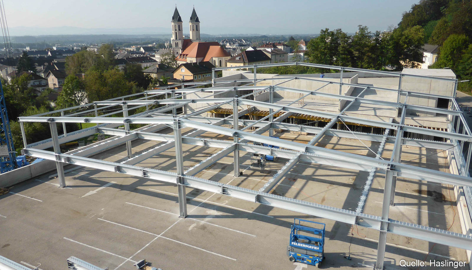 HASLINGER STAHLBAU lieferte und montierte die gesamte Stahlkonstruktion in feuerverzinkter Ausführung, die Deckenelemente für das Parkdeck im System "Hoesch-Additivdecke" sowie die Randsicherung mit dem Anprallschutz aus verzinkten Gitterstabmatten.