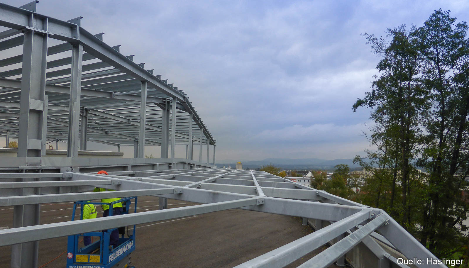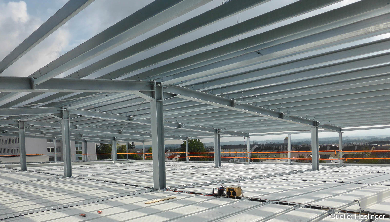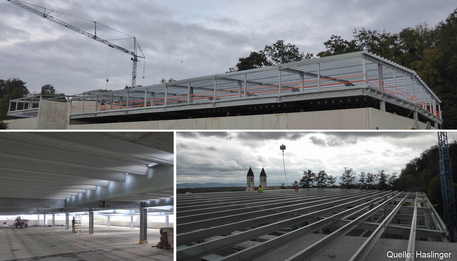 HASLINGER STAHLBAU lieferte und montierte die gesamte Stahlkonstruktion in feuerverzinkter Ausführung, die Deckenelemente für das Parkdeck im System "Hoesch-Additivdecke" sowie die Randsicherung mit dem Anprallschutz aus verzinkten Gitterstabmatten.