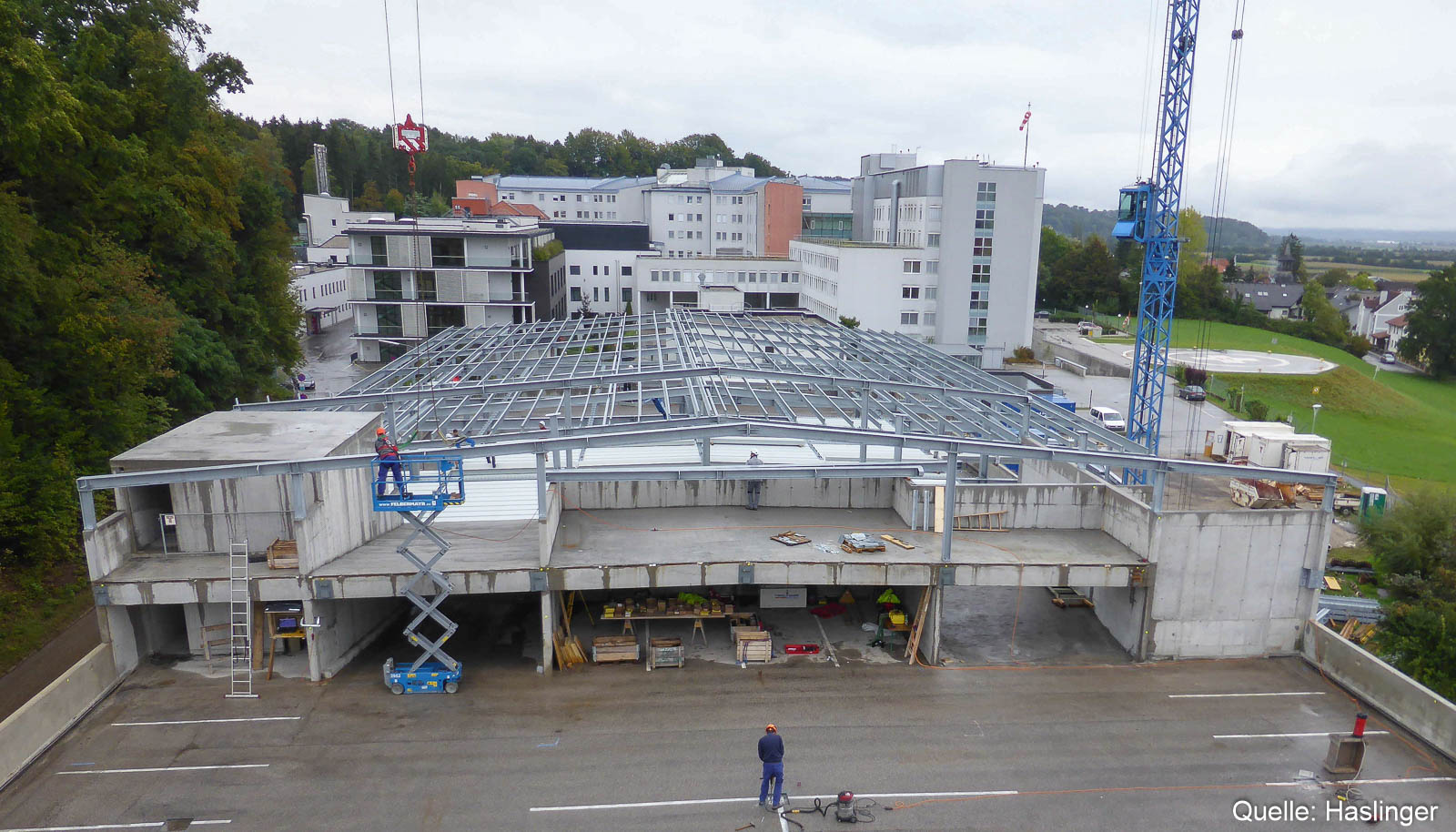 Im Auftrag der Stadtgemeinde Amstetten wurde das Parkdeck am Klinikum Amstetten in Stahlbauweise um eine Parkebene erweitert und gleichzeitig überdacht. So entstanden zusätzliche 94 Parkplätze. Durch die Überdachung der obersten Parkebene entfällt in Zukunft ein Großteil der Kosten für die Winterbetreuung.