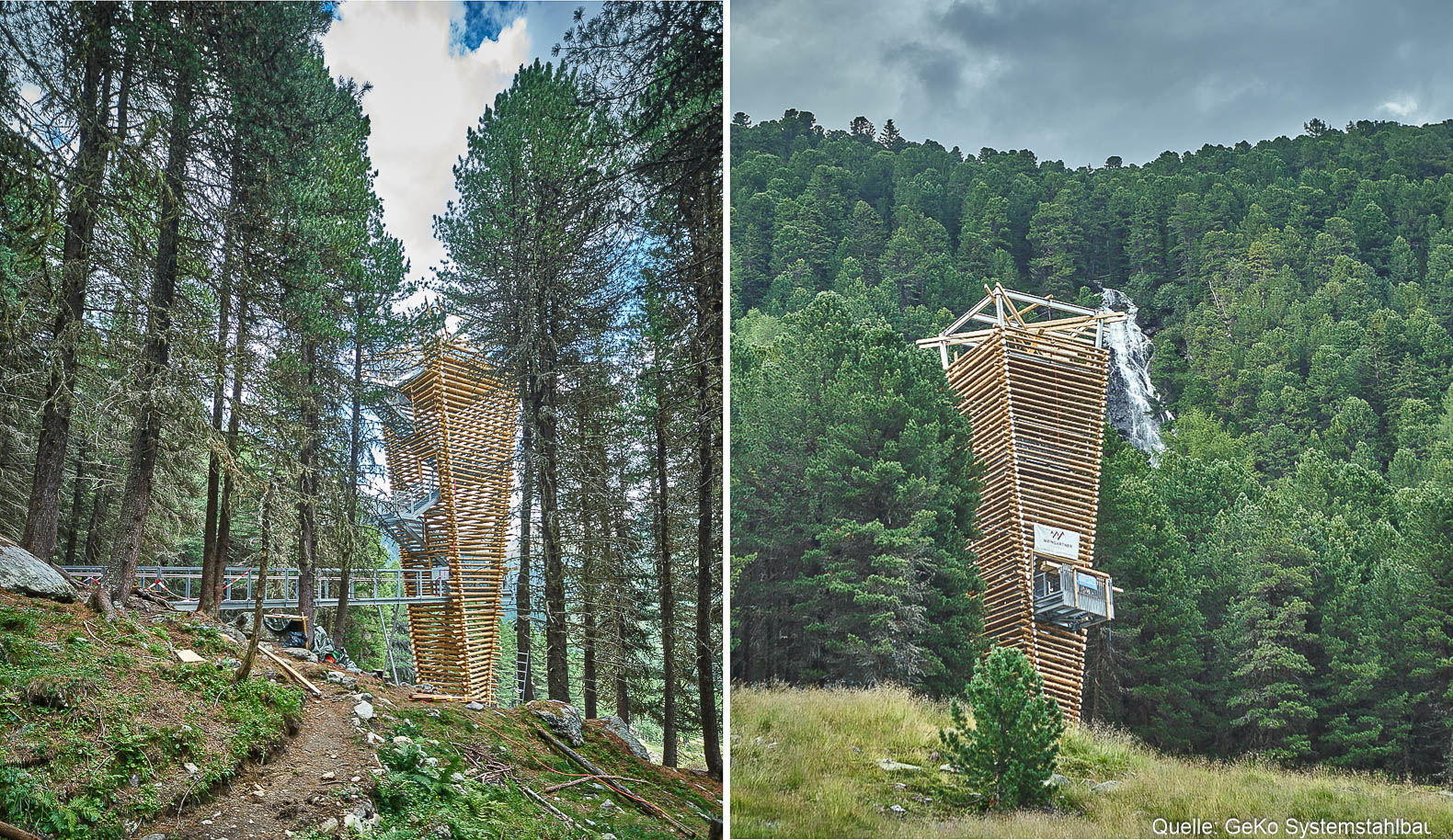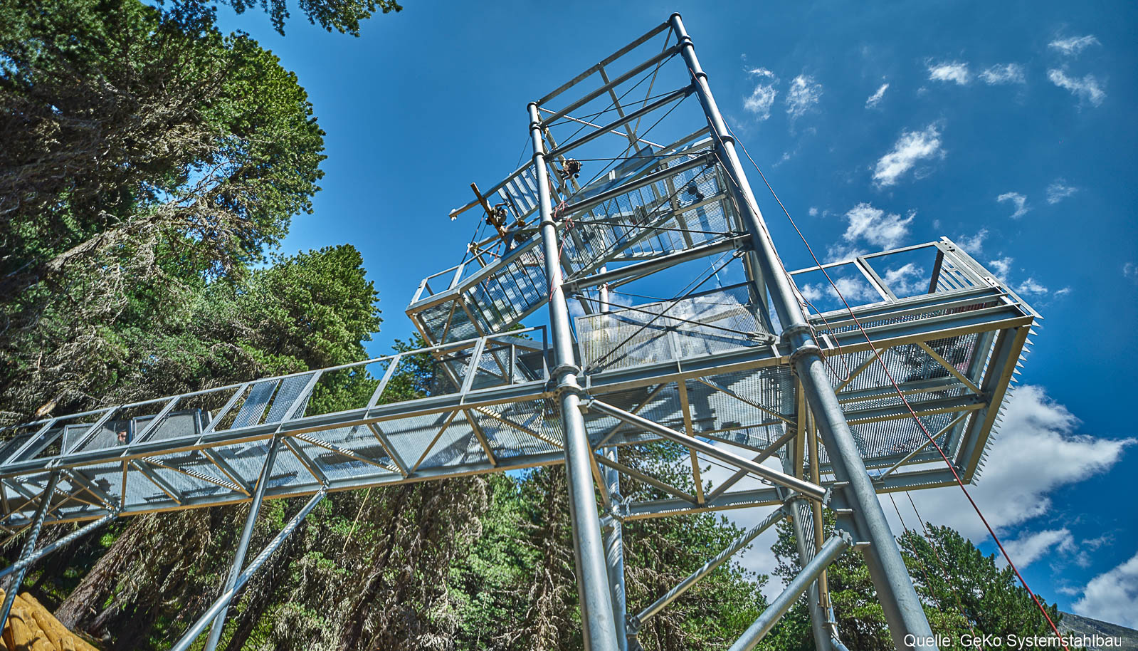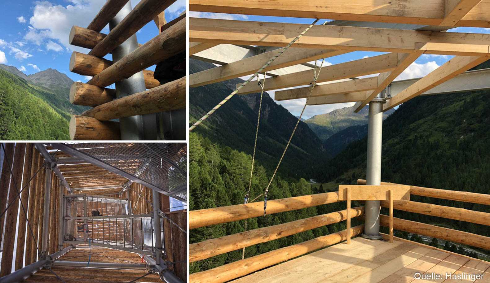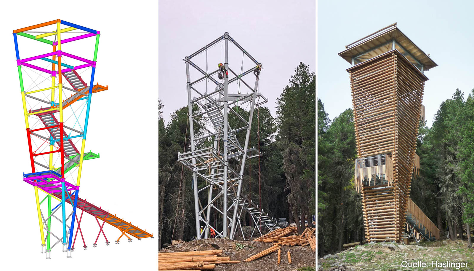 HASLINGER STAHLBAU lieferte eine außergewöhnliche Stahlkonstruktion. Die Turmkonstruktion besteht primär aus einer feuerverzinkten Stahlkonstruktion mit vier tragenden Stahlsäulen, die durch Podeste statisch miteinander verbunden sind. Durch die sich nach oben öffnende Grundkonstruktion vergrößert sich die Grundfläche schraubenförmig von einem Achsmaß von 2 m x 2 m im Fundamentbereich auf 5,185m x 5,185m im Bereich der obersten Aussichtsplattform. Der Zugangssteg dient gleichzeitig als Verankerung und Kippsicherung der Gesamtkonstruktion. Die Stahltragkonstruktion wurde nachträglich mit Schleifholzstämmen verkleidet.