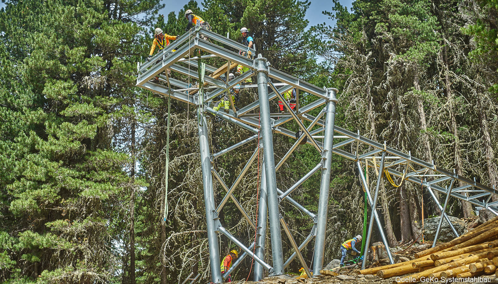 Die Einbaustelle war aus Naturschutzgründen mit Fahrzeugen nicht zugänglich. Die gesamte Stahlkonstruktion musste in flugtauglichen Einheiten vorgefertigt werden, sodass die Montage mit einem Hubschrauber erfolgen konnte.