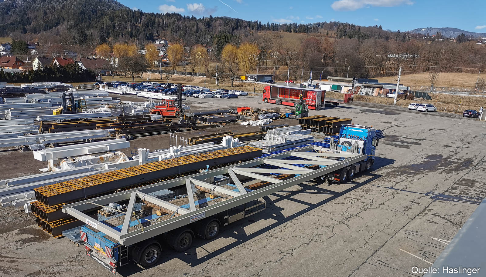 Der Leistungsumfang umfasste ca. 600 lfm. Vordachkonstruktion, 1.100 lfm. Fassadenriegel, diverse Vordächer und zwei Verbindungsfachwerke von Bürobauten. Die 22 m langen und 16 to schweren Verbindungsfachwerke mit einer Höhe von fast 5 m wurden mit Sondertransporten auf die Baustelle angeliefert.
