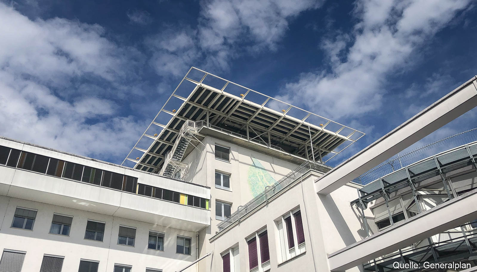 Die Dachlandestelle befindet sich am höchsten Punkt des Kinderklinikkomplexes an der Westseite des Bestandsgebäudes, ca. 4,6 m über der Dachebene des Hauptgebäudes. Sie wird ausschließlich für den Einsatz von Ambulanz- und Rettungsflügen genutzt und stellt eine Direktverbindung zu den Notfalleinrichtungen dar.
