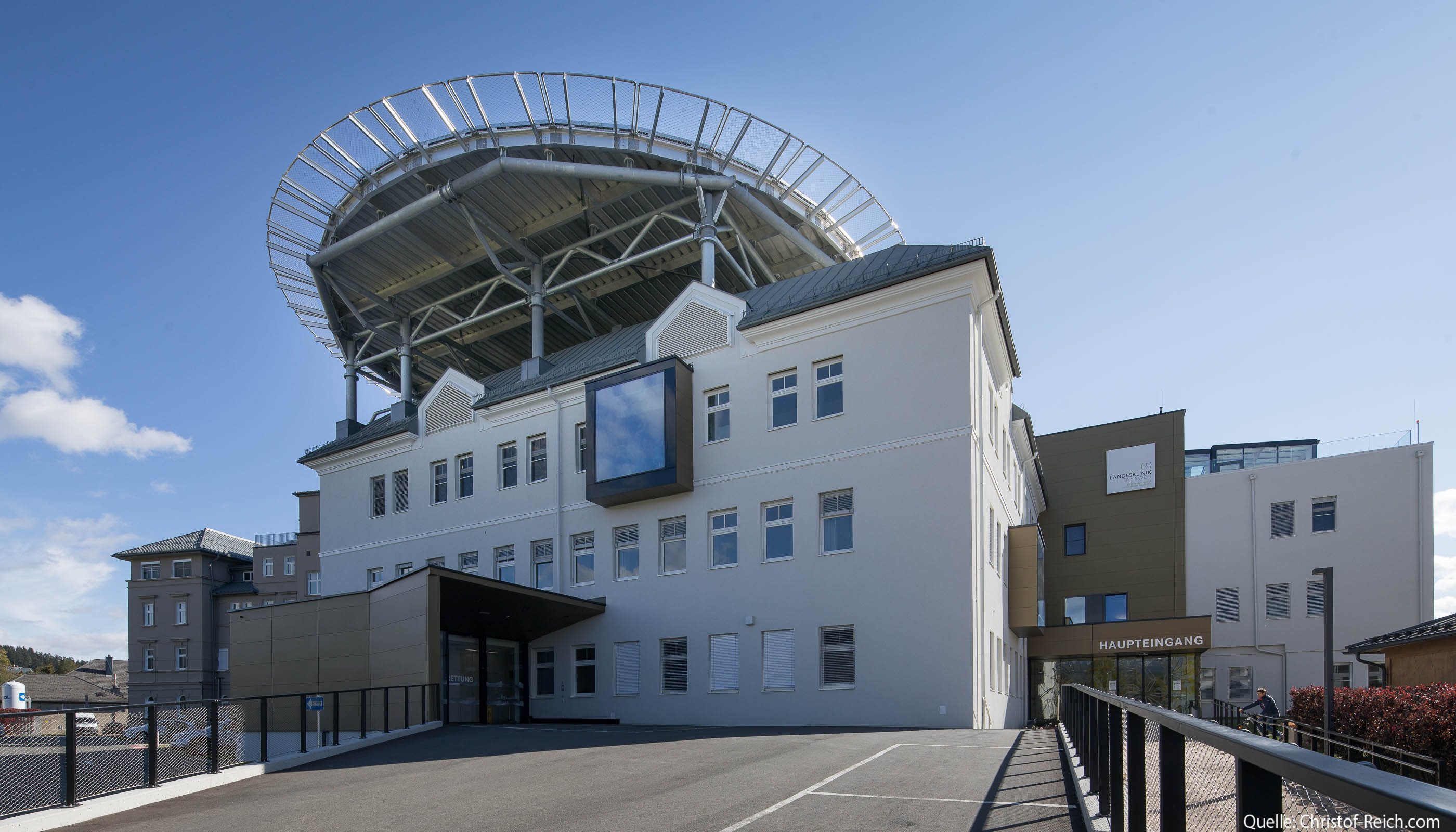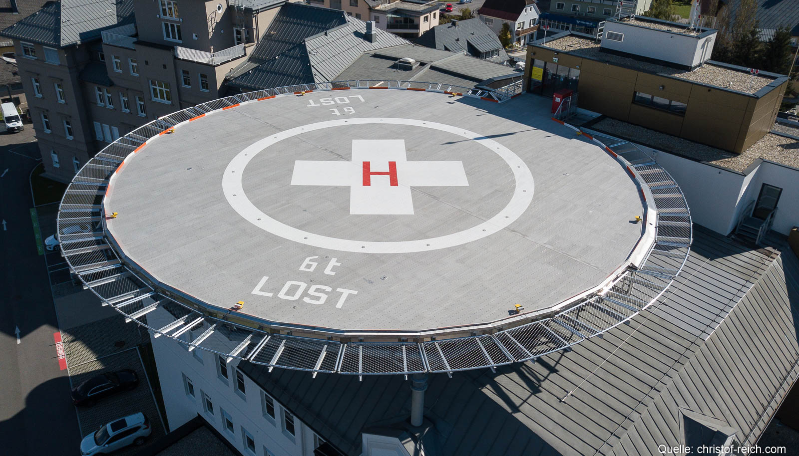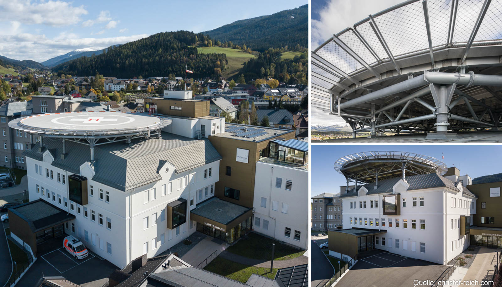 Der neue Hubschrauberlandeplatz der Landesklinik Tamsweg wurde von HASLINGER STAHLBAU über dem Dach des Behandlungstraktes mit einem Niveau von 20 m über dem Erdgeschoss errichtet.