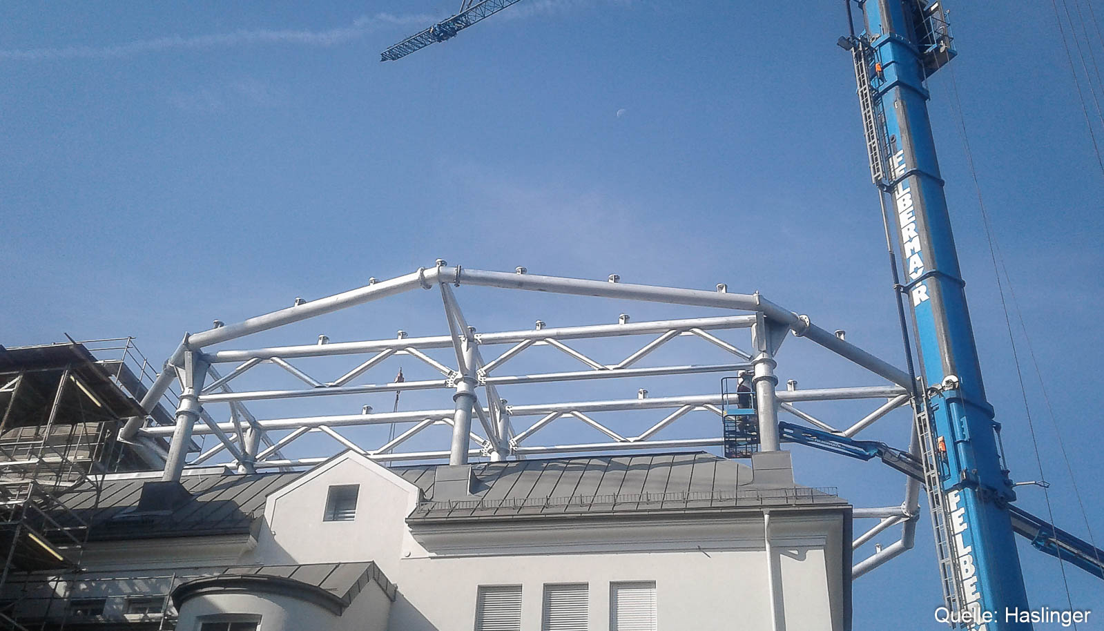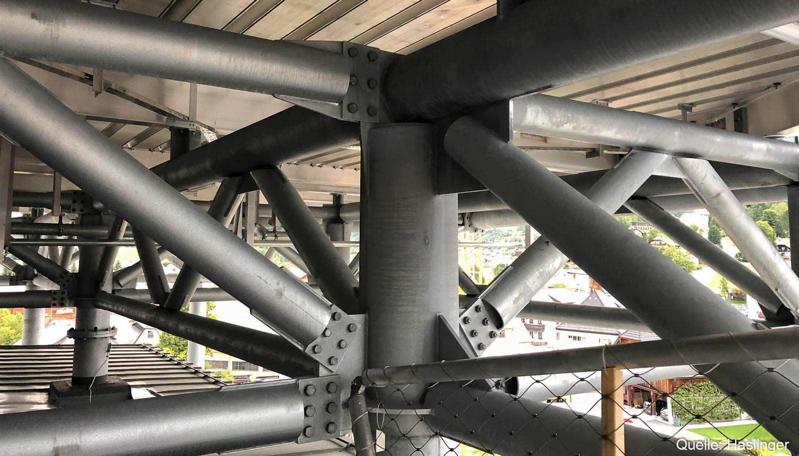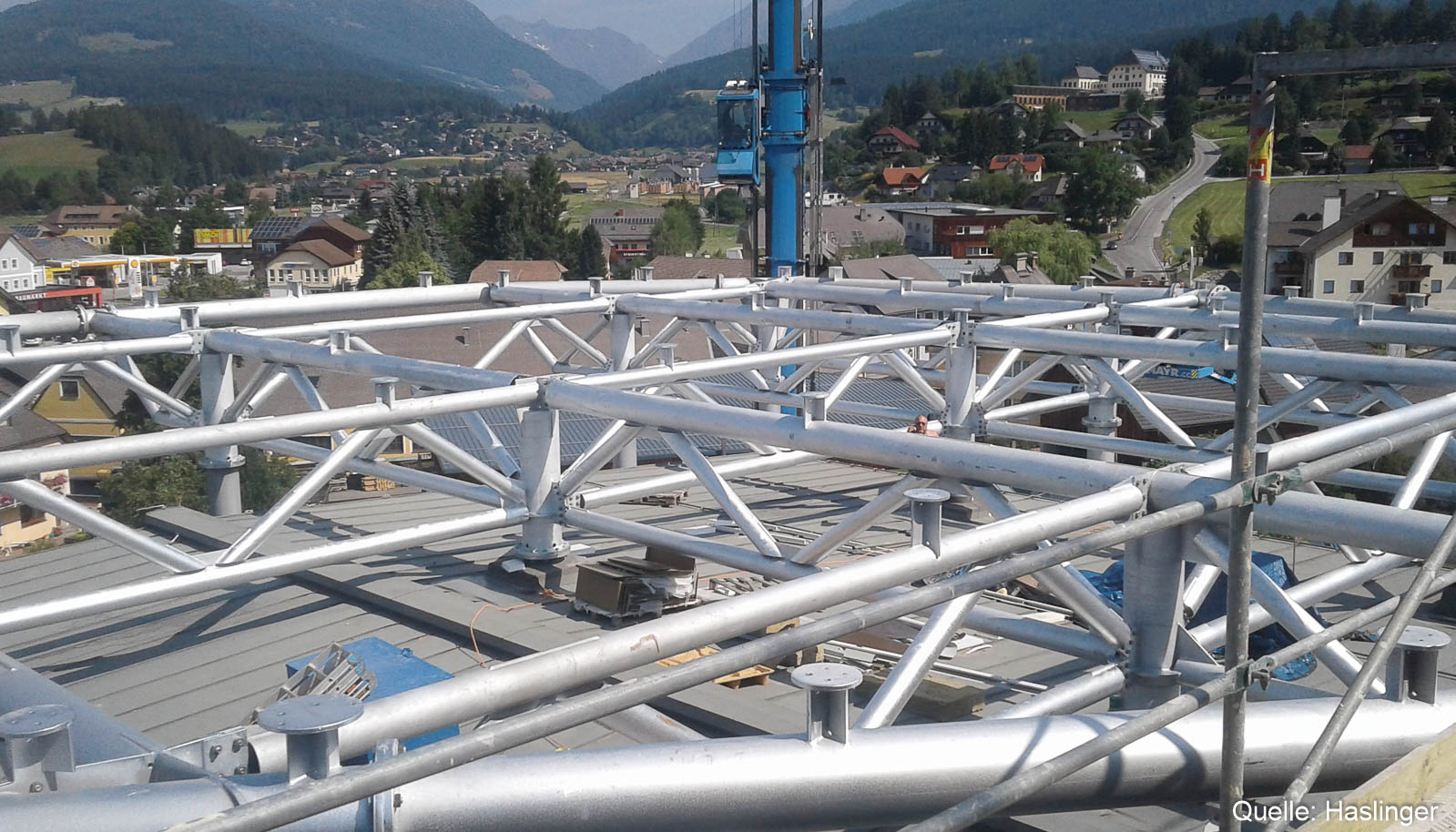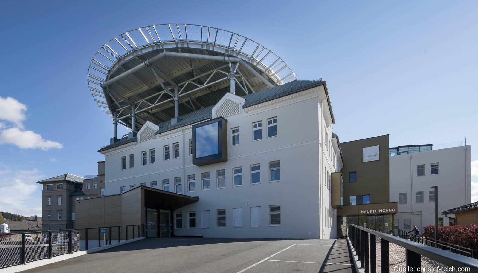 Der neue Hubschrauberlandeplatz der Landesklinik Tamsweg wurde von HASLINGER STAHLBAU über dem Dach des Behandlungstraktes mit einem Niveau von 20 m über dem Erdgeschoss errichtet.