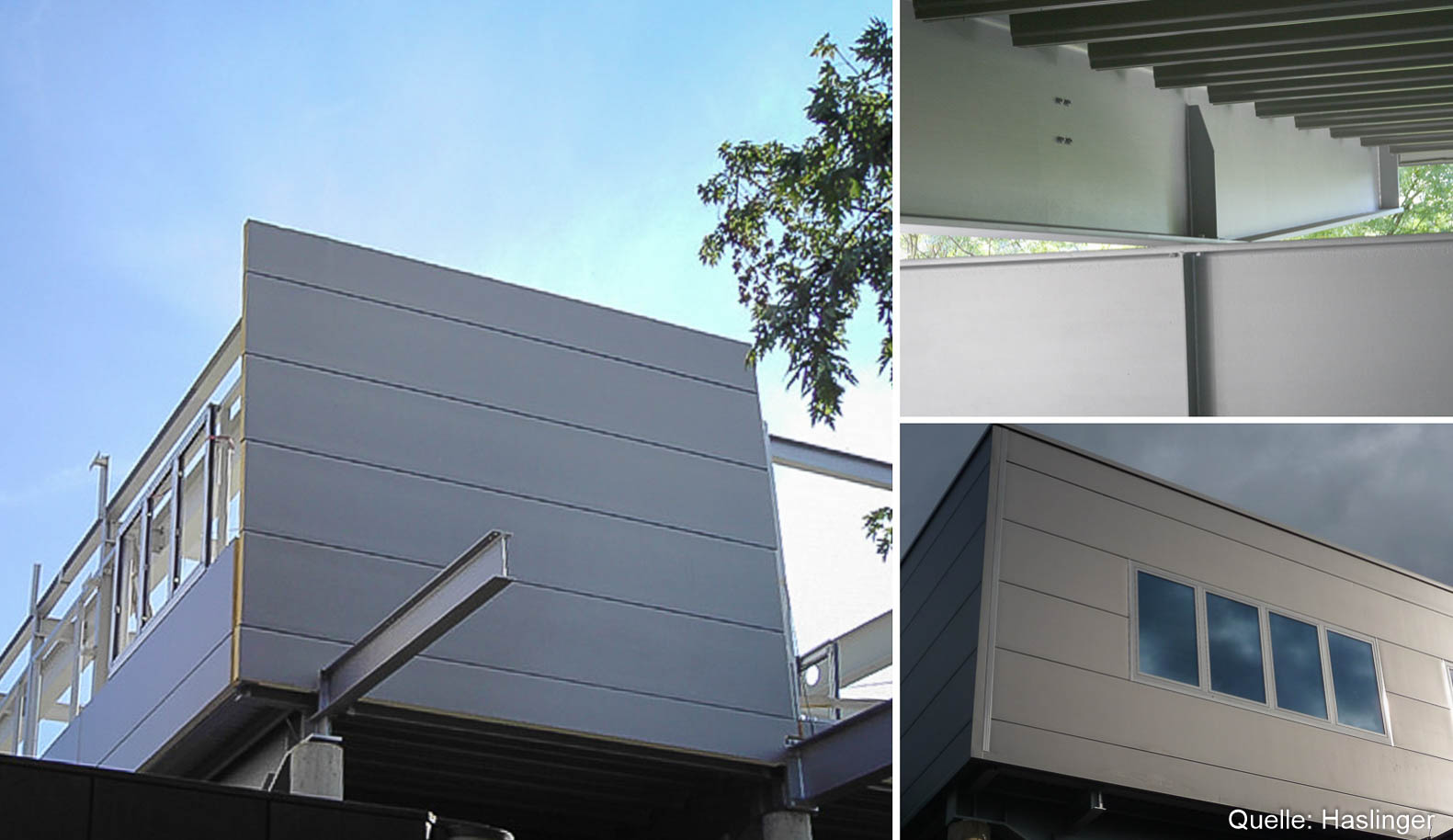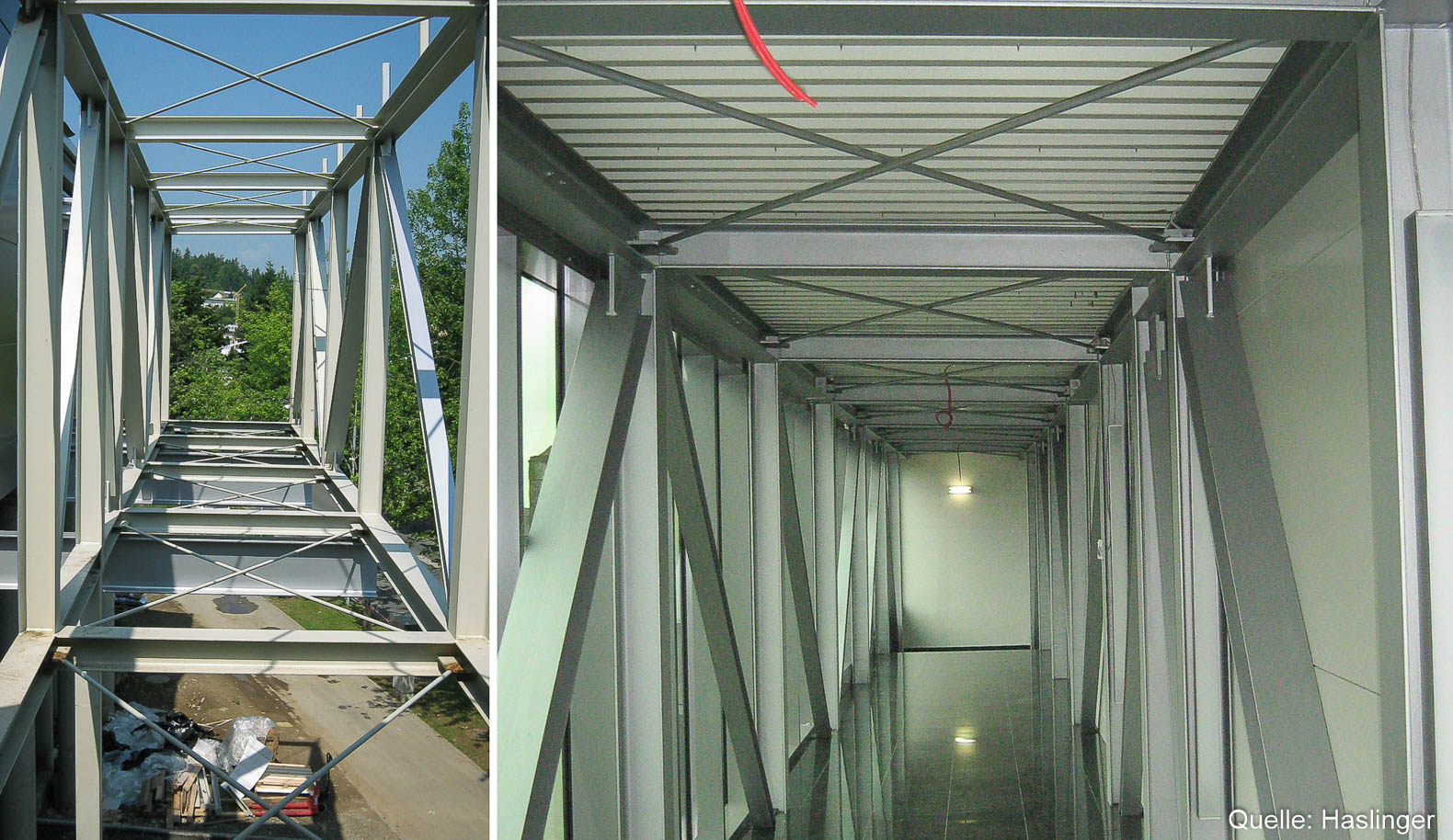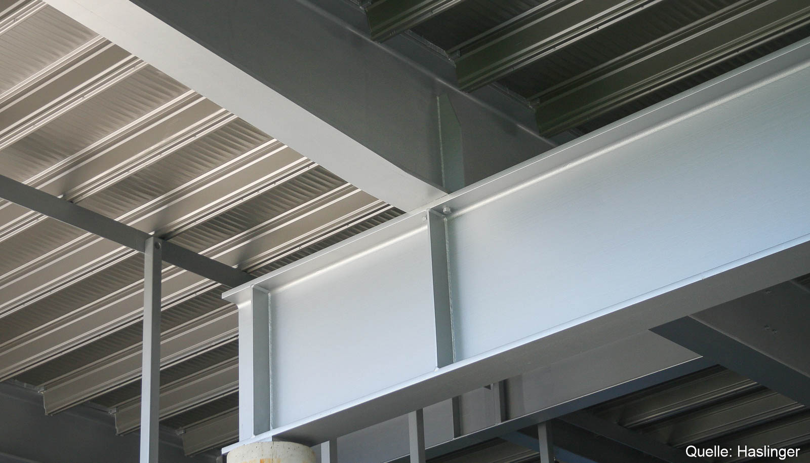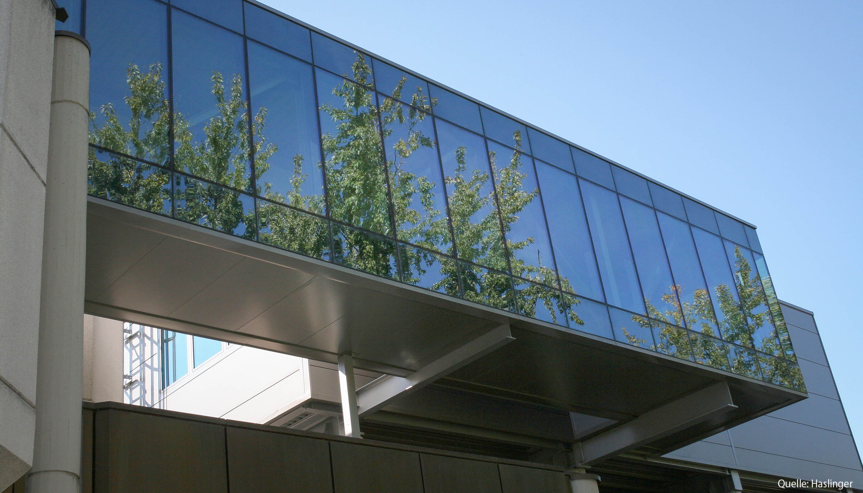 Eine Stahlverbundkonstruktion, die freigespannt 20 m über der bestehenden Garage schwebt, bildet die tragende Grundkonstruktion für das neue Bürogebäude. Die Erschließung erfolgt über eine freitragende Verbindungsbrücke aus Stahl und Glas. HASLINGER STAHLBAU lieferte als Generalunternehmer die tragende Stahlverbundkonstruktion für das Bürogebäude und den Verbindungsgang, die Verbunddecke (System Hoesch Additivdecke), die Dachelemente, die Fassadenverkleidungen (System Hoesch FSI) mit flächenbündig integrierten Fensterelementen sowie die Glasfassadenkonstruktion.