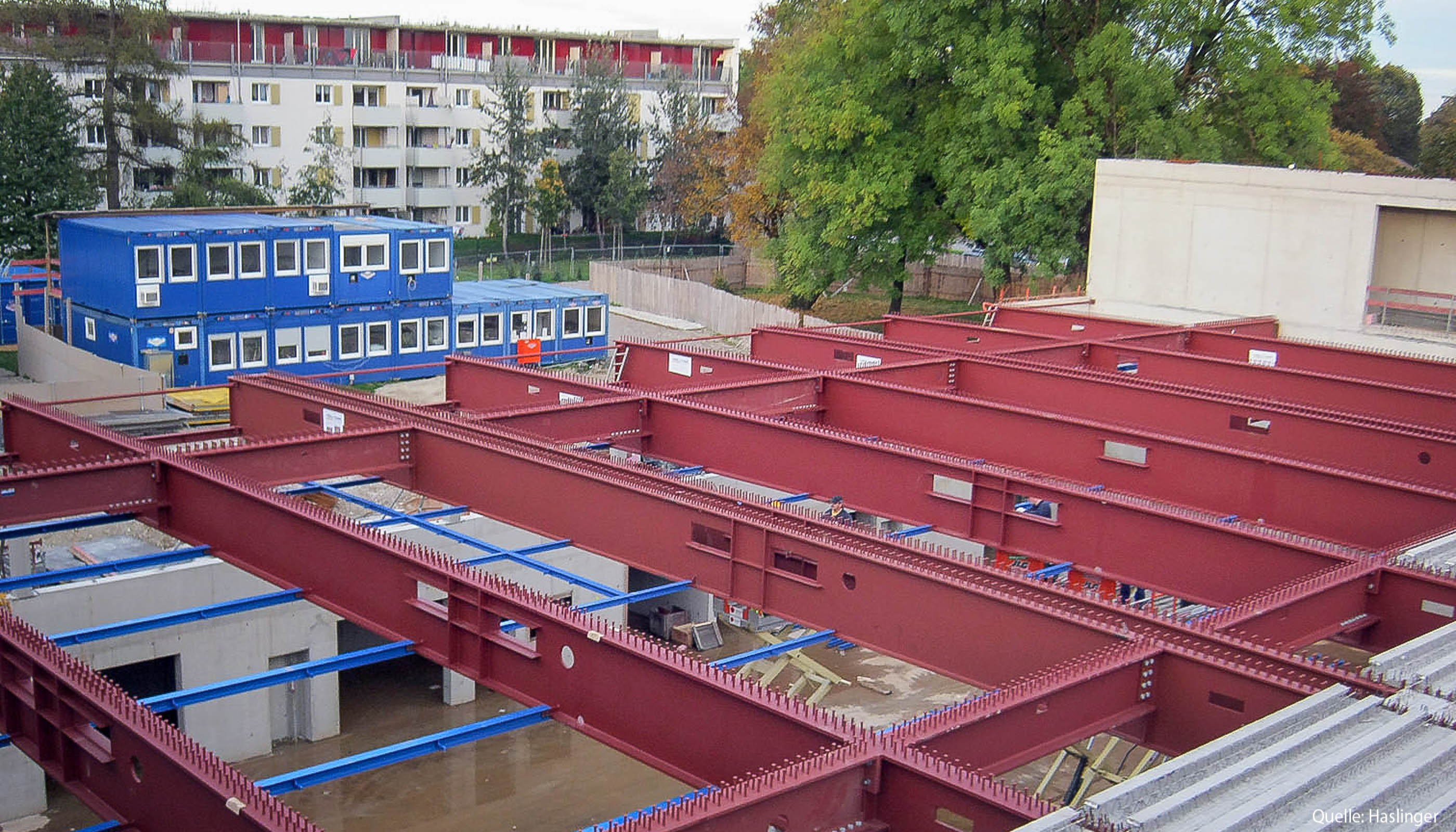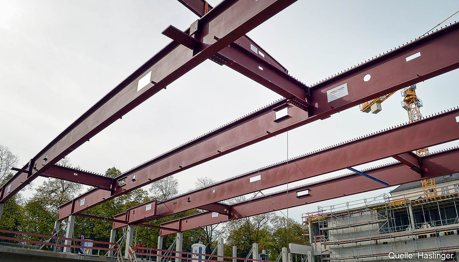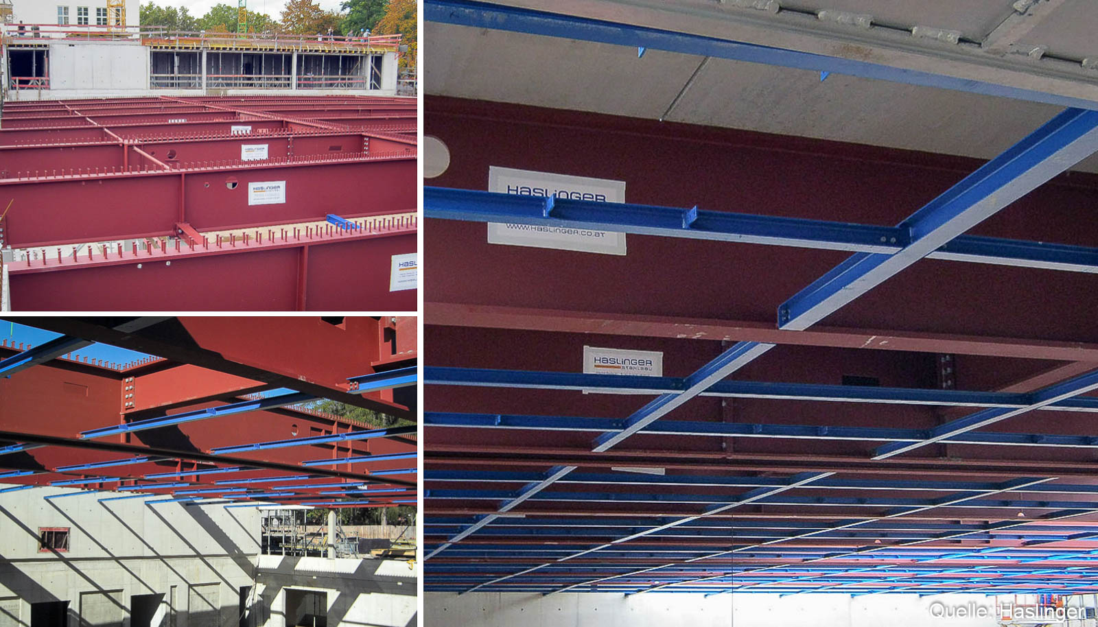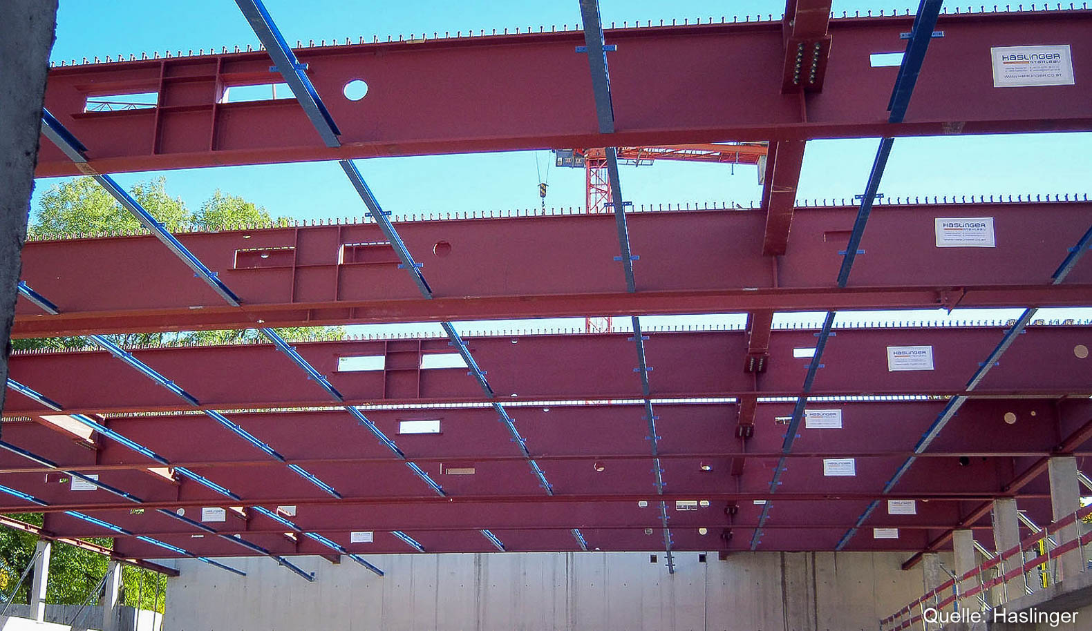 HASLINGER STAHLBAU wurde mit der Lieferung und Montage der Deckenkonstruktion, bestehend aus Stahlverbundträgern und der Unterkonstruktion für die abgehängte Decke, sowie mit dem Brandschutzanstrich beauftragt. Die Einzelteile wurden mit bis zu 32 m Länge vorgefertigt und geliefert.