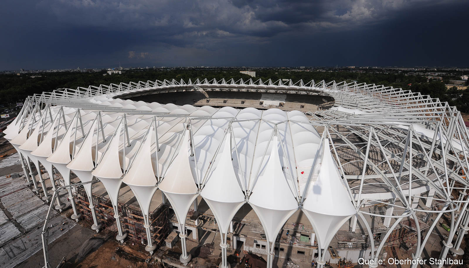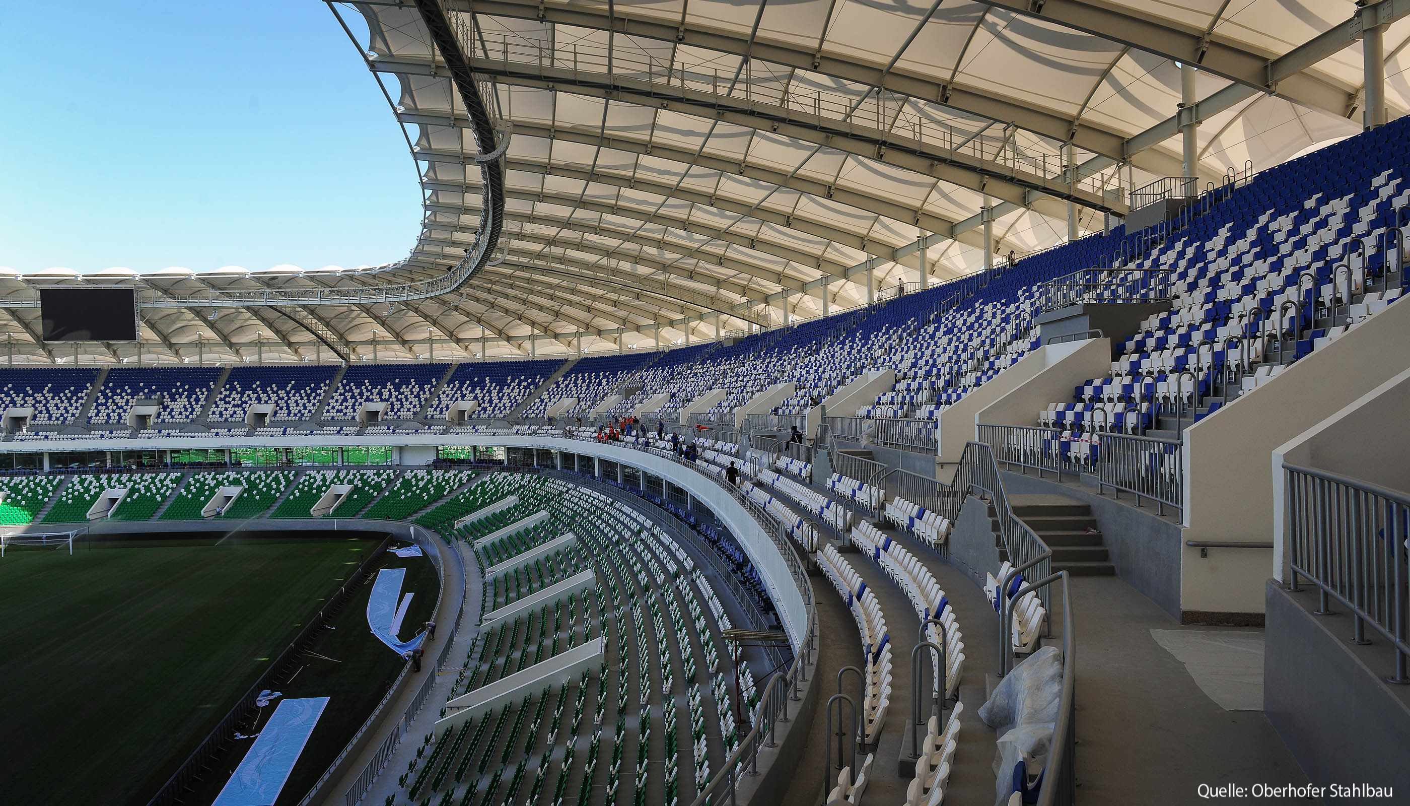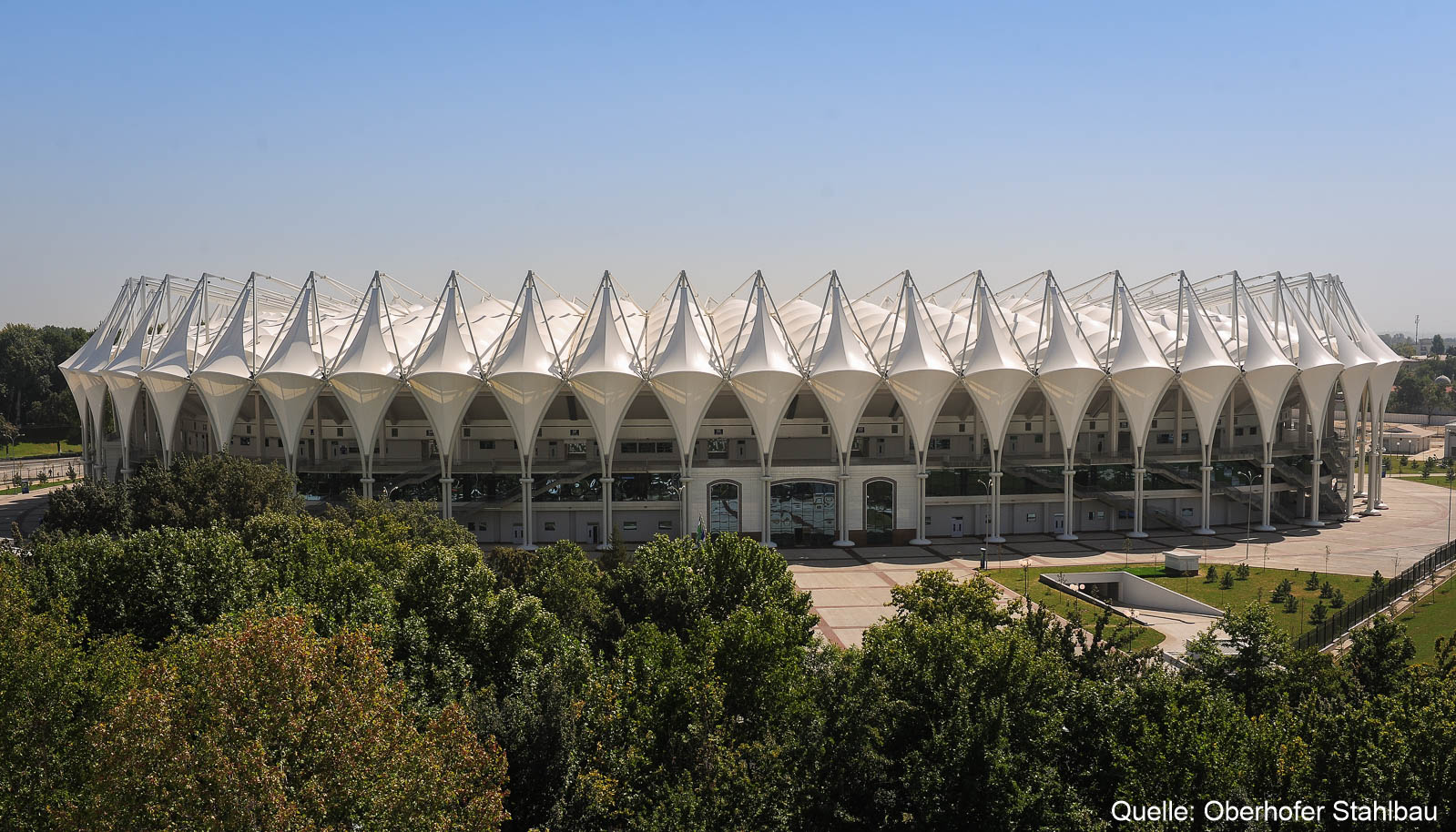 HASLINGER STAHLBAU war im Auftrag der Firma Oberhofer Stahlbau / Saalfelden für die Entwicklung der Anschlussdetails, die Werks- und Montageplanung sowie die Fertigung inklusive der Grundbeschichtung verantwortlich. Die Baustelle war ca. 5.600 km von den HASLINGER Werken entfernt. Umso wichtiger war es, alle Bauteile exakt zu fertigen, die Toleranzen genauestens einzuhalten und großes Augenmerk auf die Endkontrolle in der Werkstätte zu legen. Diese Anforderungen konnten qualitativ einwandfrei umgesetzt werden. Dadurch konnte die gesamte Stahlkonstruktion ohne Anpassungsarbeiten auf der Baustelle in Tashkent montiert werden.