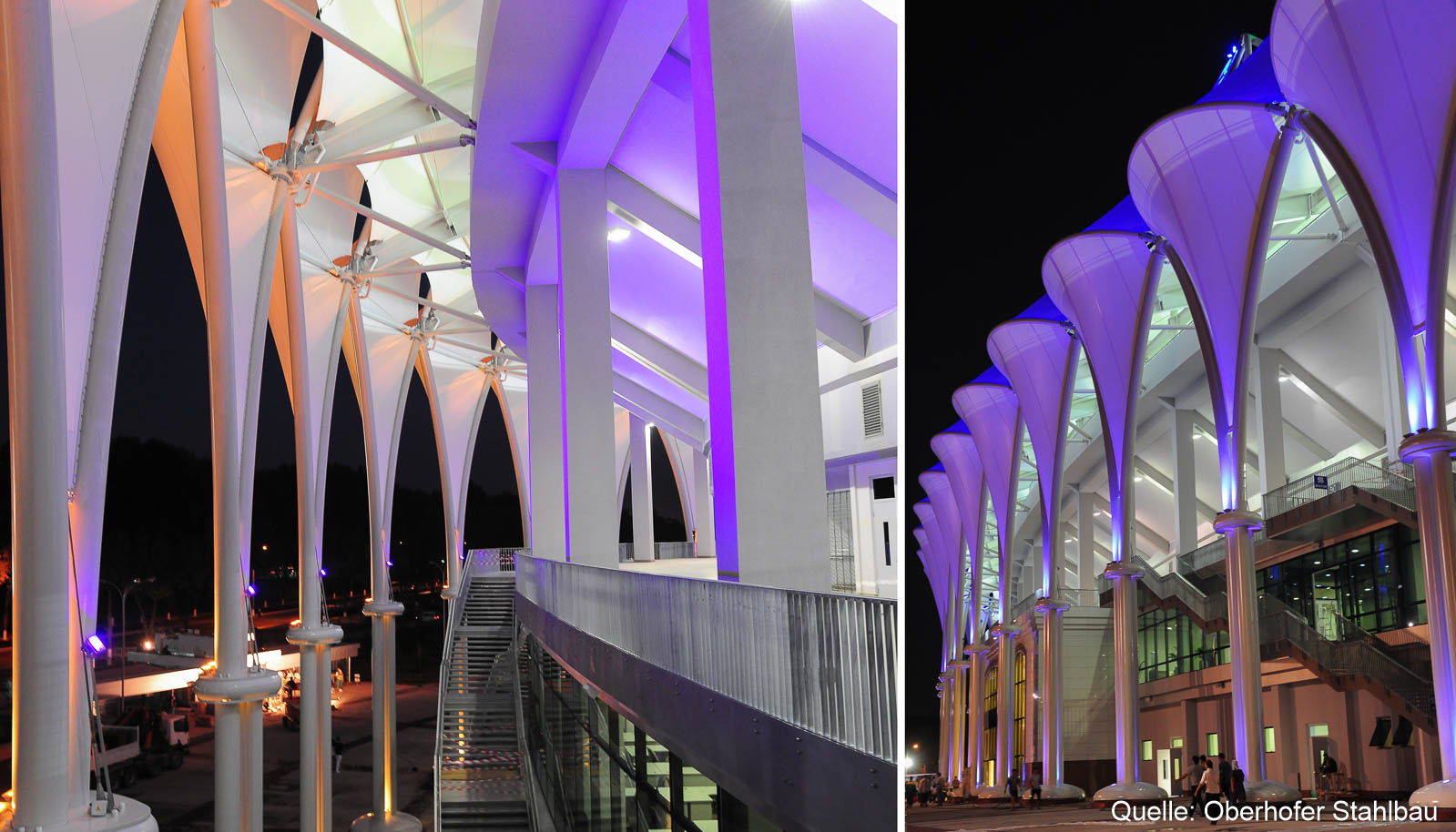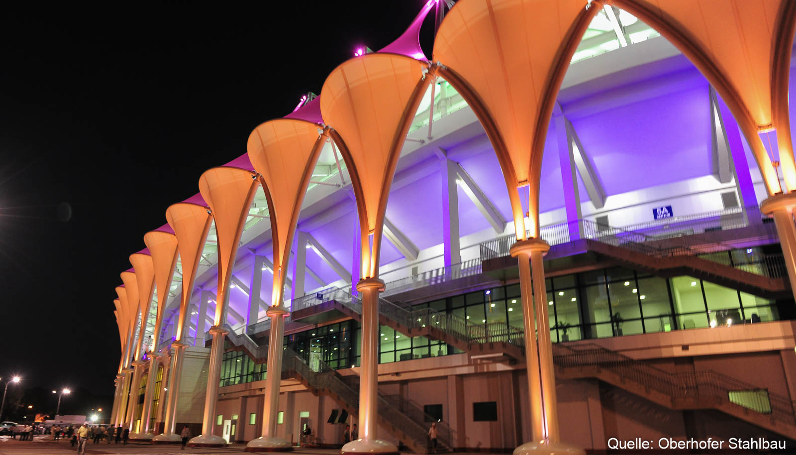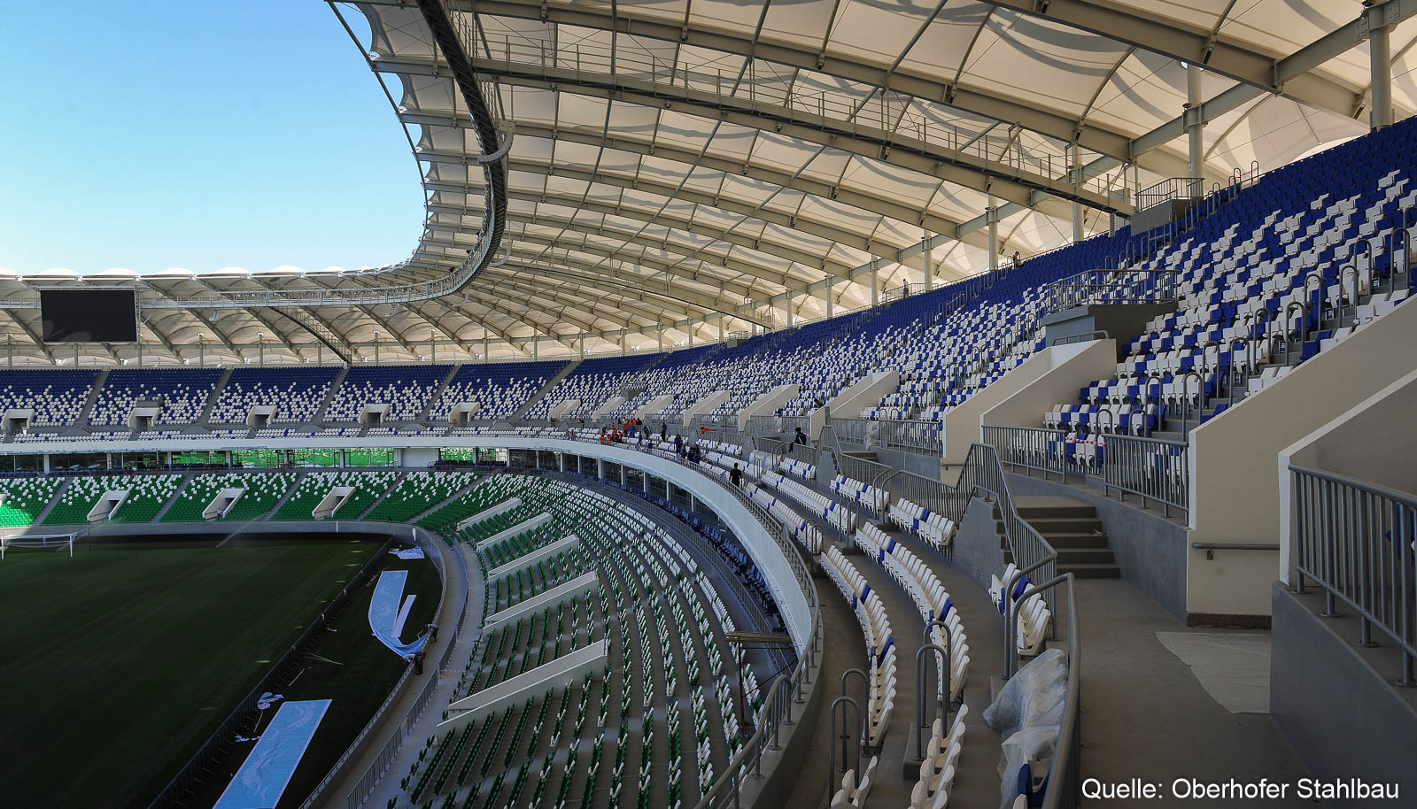 HASLINGER STAHLBAU war im Auftrag der Firma Oberhofer Stahlbau / Saalfelden für die Entwicklung der Anschlussdetails, die Werks- und Montageplanung sowie die Fertigung inklusive der Grundbeschichtung verantwortlich. Die Baustelle war ca. 5.600 km von den HASLINGER Werken entfernt. Umso wichtiger war es, alle Bauteile exakt zu fertigen, die Toleranzen genauestens einzuhalten und großes Augenmerk auf die Endkontrolle in der Werkstätte zu legen. Diese Anforderungen konnten qualitativ einwandfrei umgesetzt werden. Dadurch konnte die gesamte Stahlkonstruktion ohne Anpassungsarbeiten auf der Baustelle in Tashkent montiert werden.