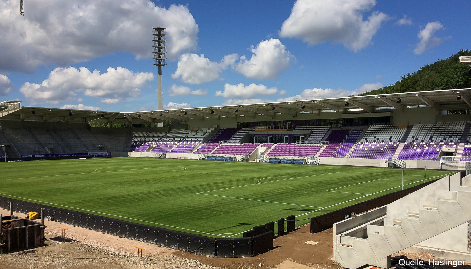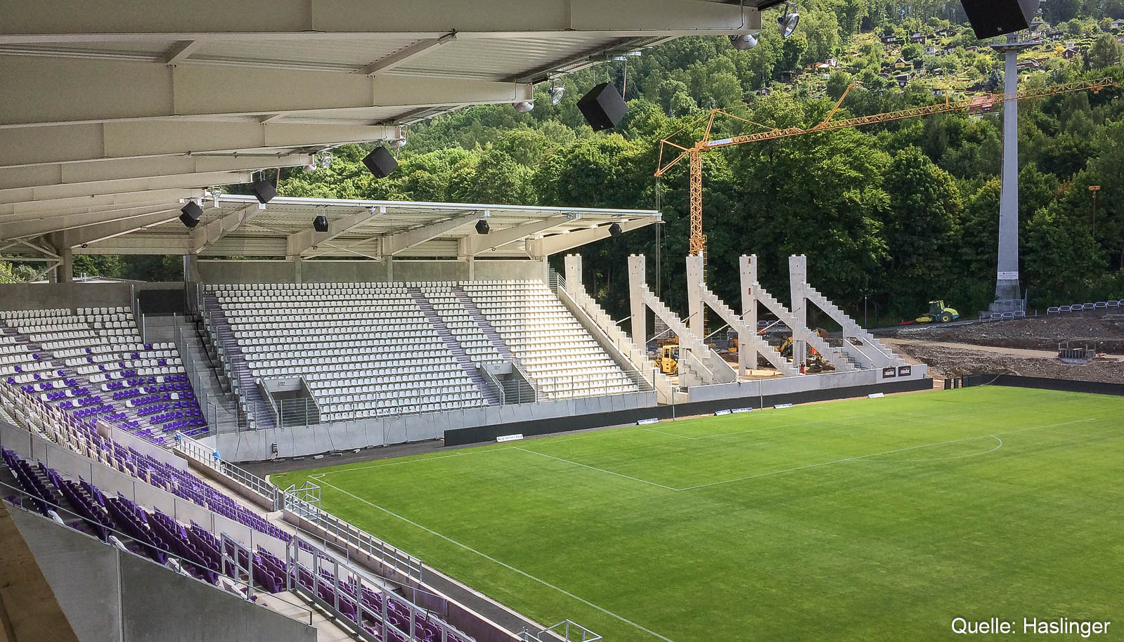 Violette Dachrandverkleidungen - entsprechend den Vereinsfarben des FC Erzgebirge Aue - weckten als vertraute Farben für die Kärntner Montagetrupps Erinnerungen an deren Heimatclub Austria Klagenfurt.