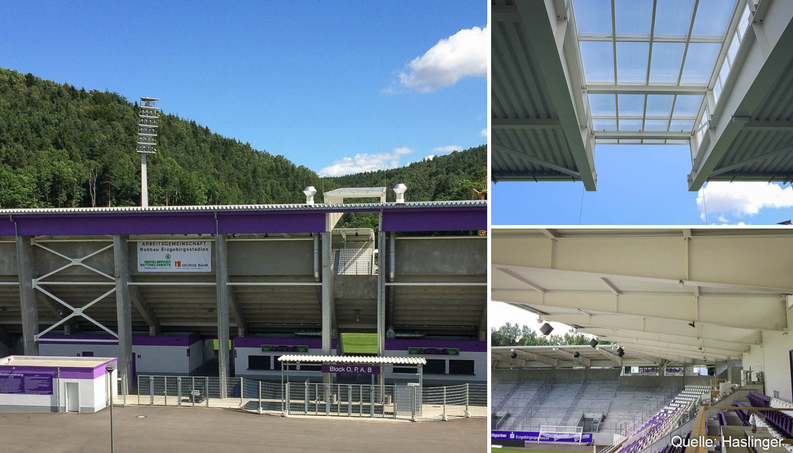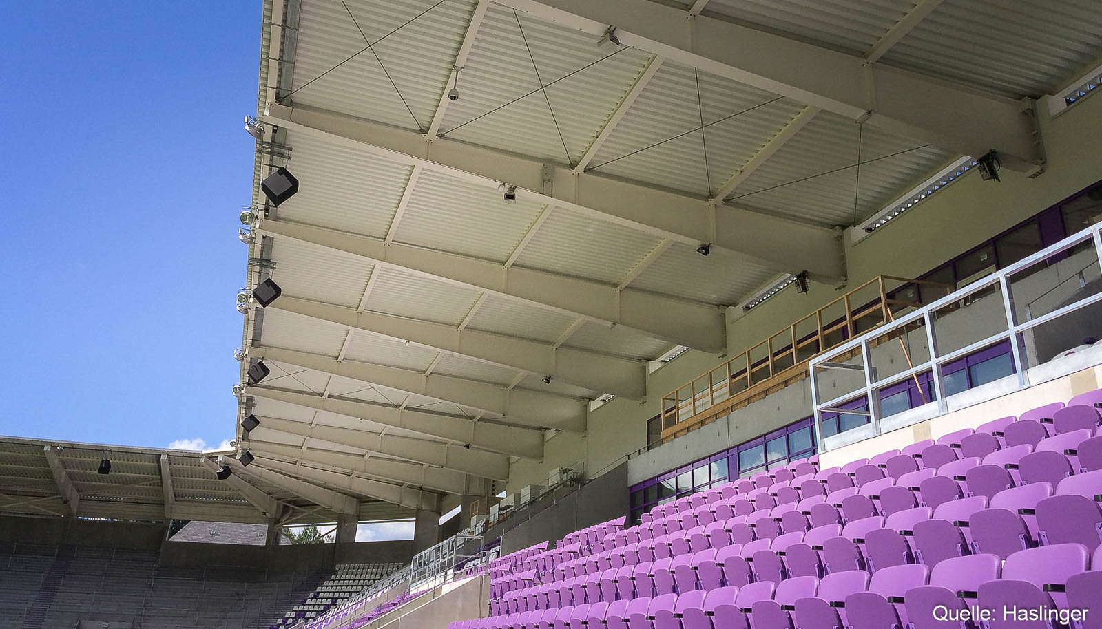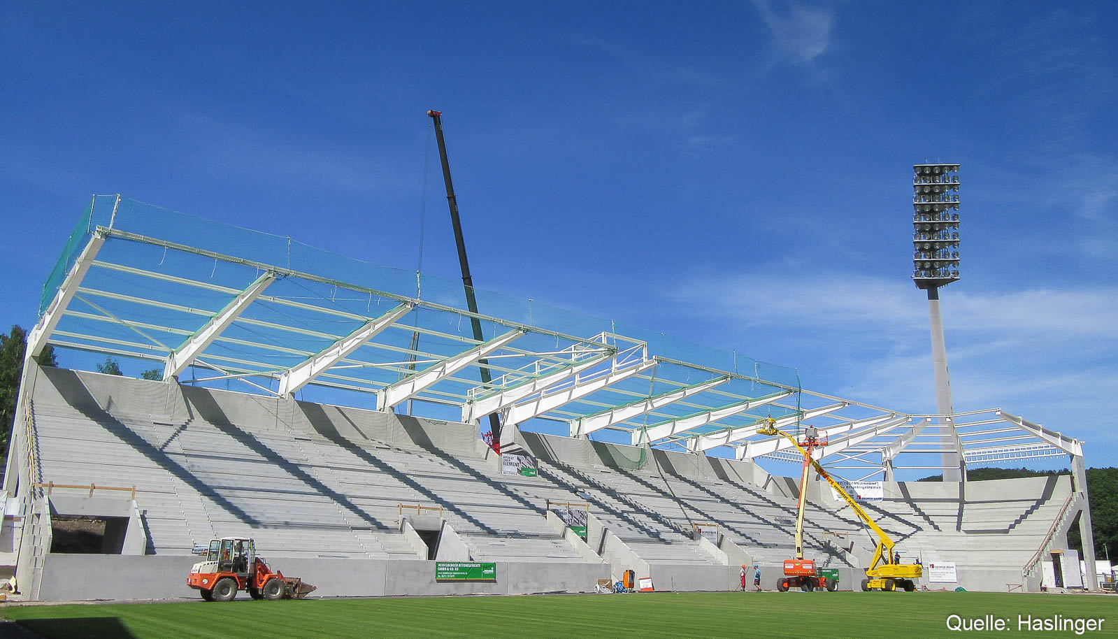 HASLINGER STAHLBAU lieferte und montierte die komplette Dachkonstruktion aus geschweißten Stahlprofilen, die auf den Betonstützen im Tribünenbereich aufliegen und bis zu 17 m frei auskragen. Die Dacheindeckung mit Stahltrapezprofilen und Lichtplatten wurde im Gesamtpaket mitgeliefert.